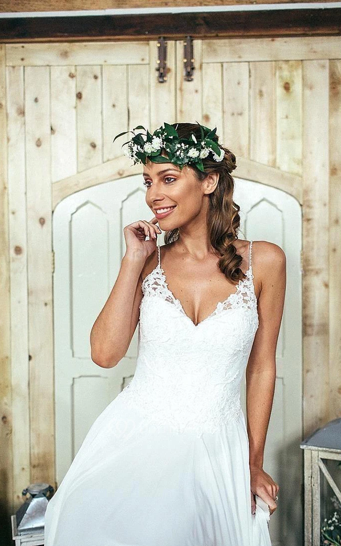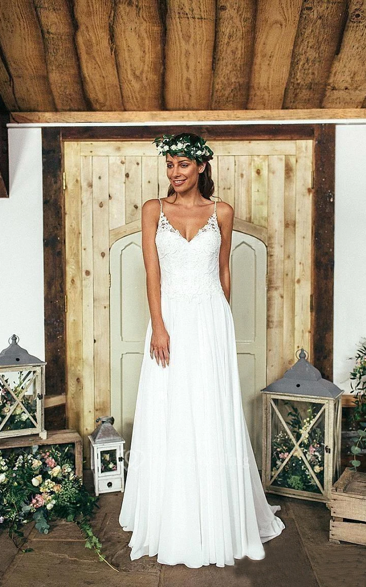 A-Line Short Spaghetti Straps V-Neck Bell Pleats Sweep Train Button Straps Chiffon Lace Dress