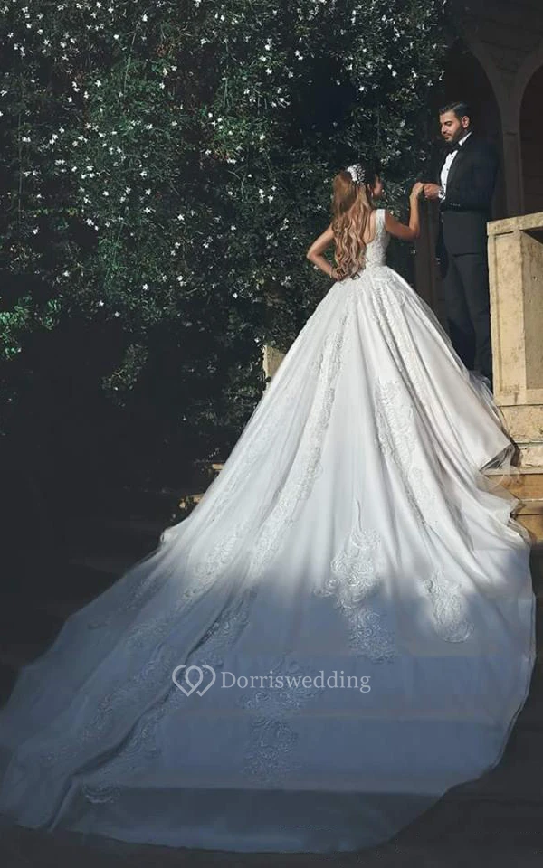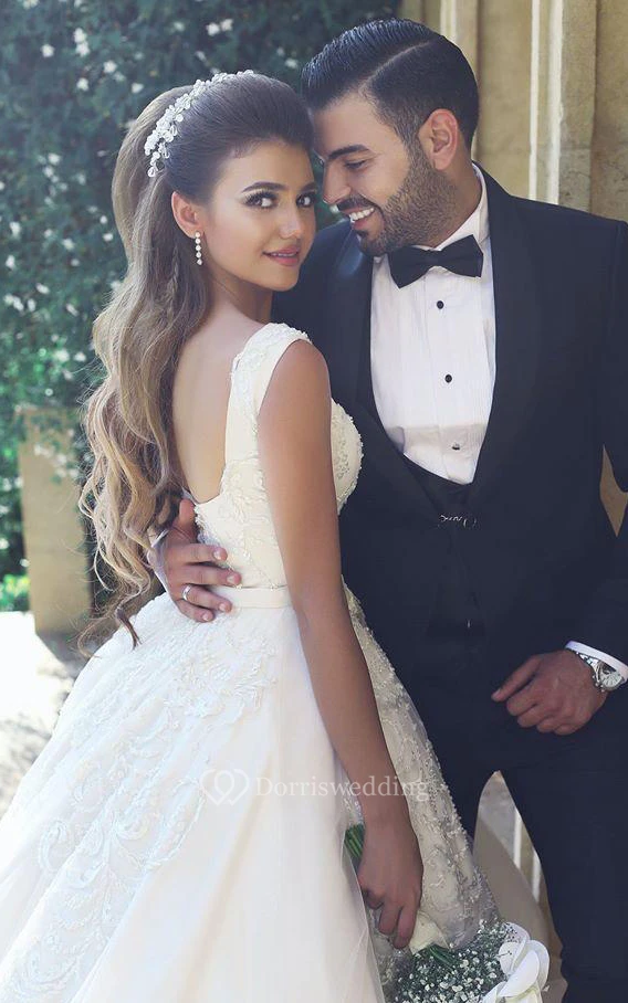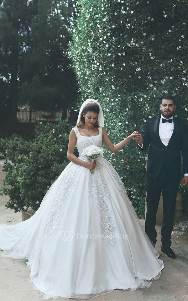 A-Line Short Square Sleeveless Bell Appliques Flower Court Train Backless Lace Bridal Dress