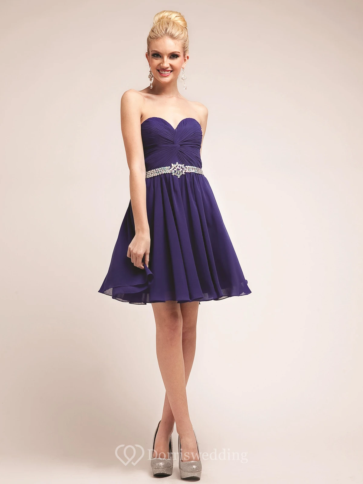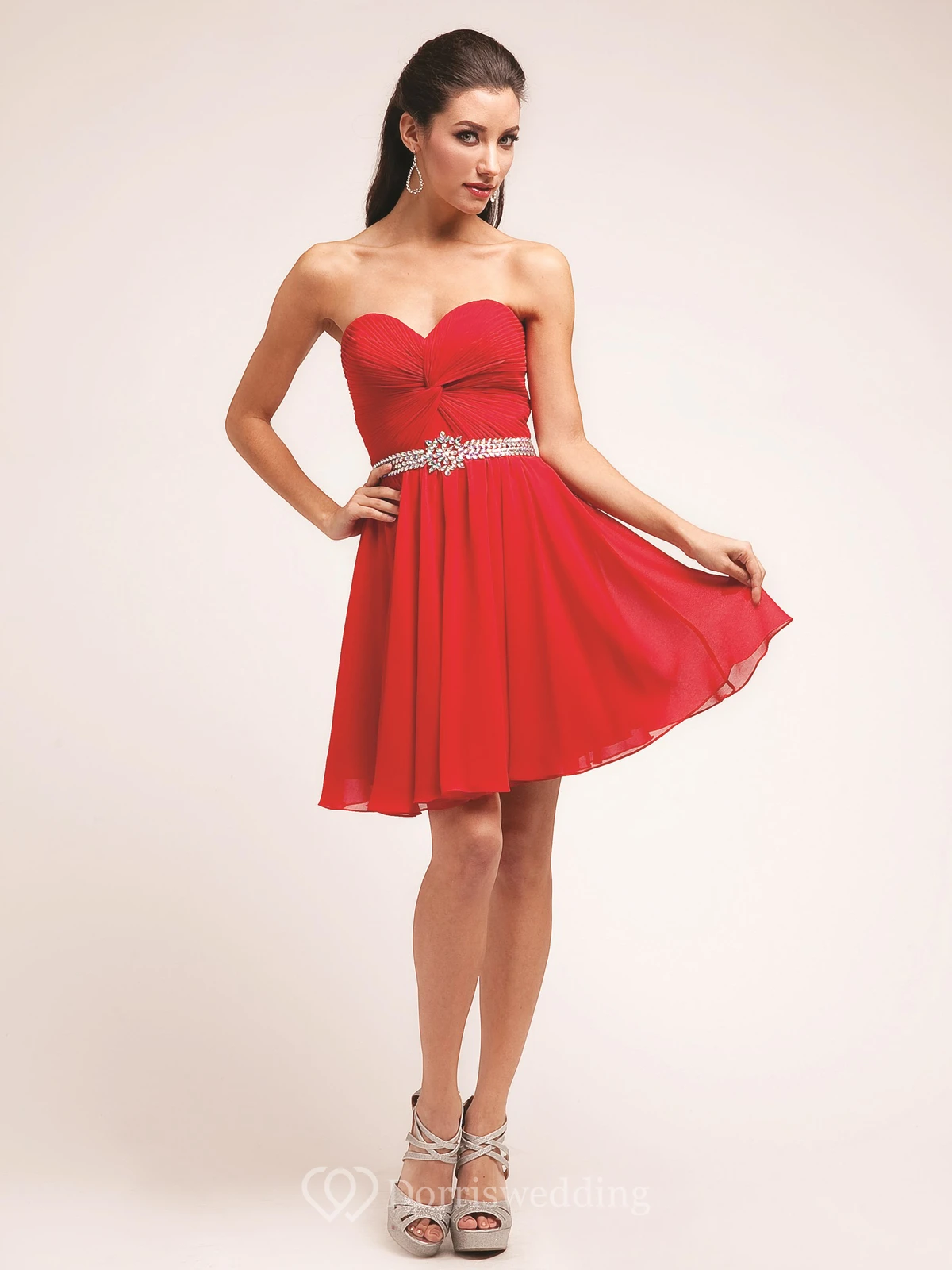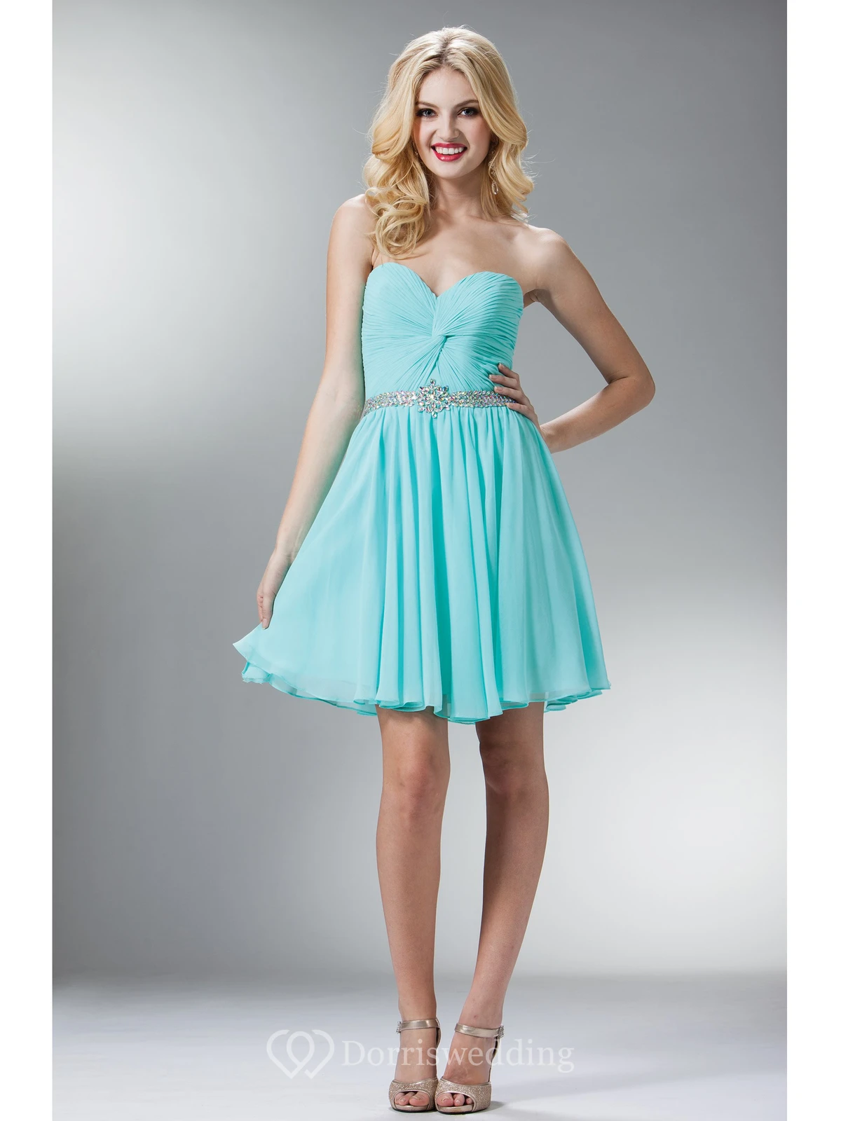 A-Line Short Sweetheart Chiffon Dress With Criss Cross And Waist Jewellery
