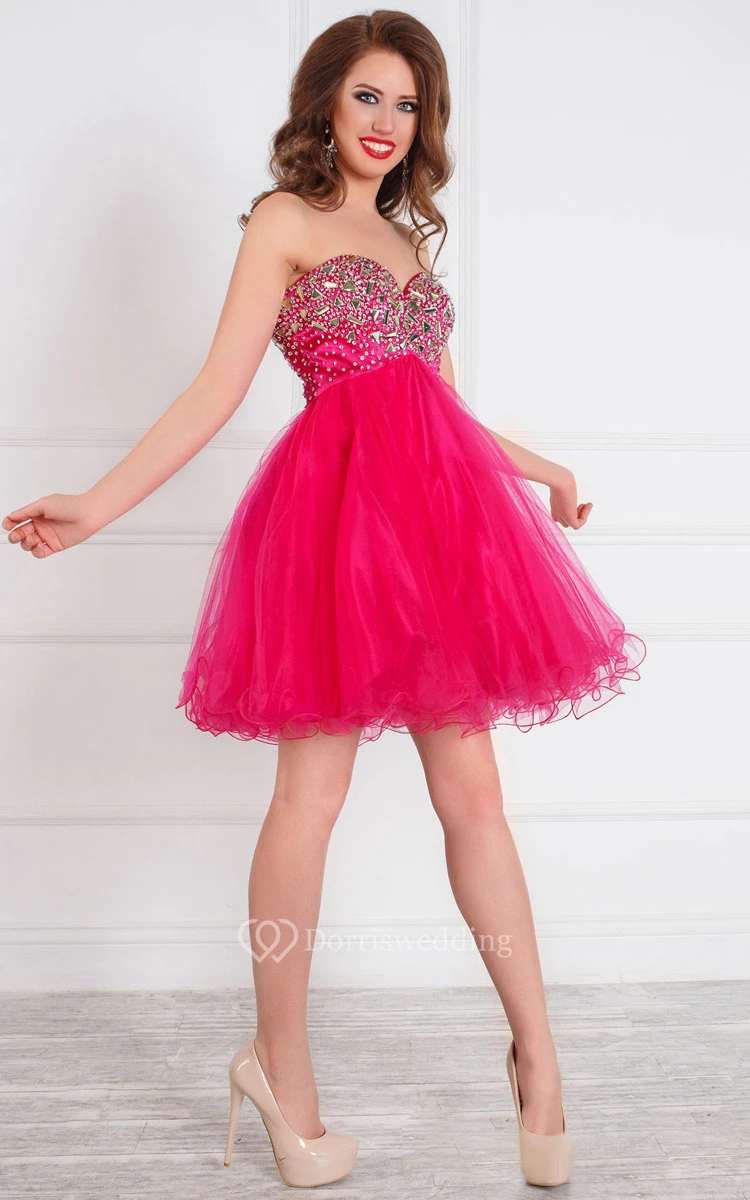 A-Line Short Sweetheart Sleeveless Tulle Beading Ruffles Zipper Dress