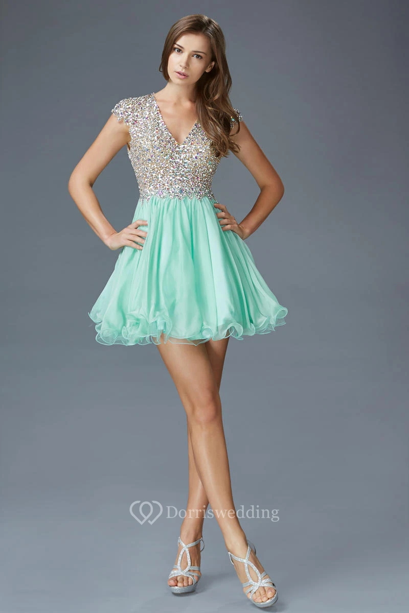 A-Line Short V-Neck Cap-Sleeve Keyhole Dress With Beading And Pleats