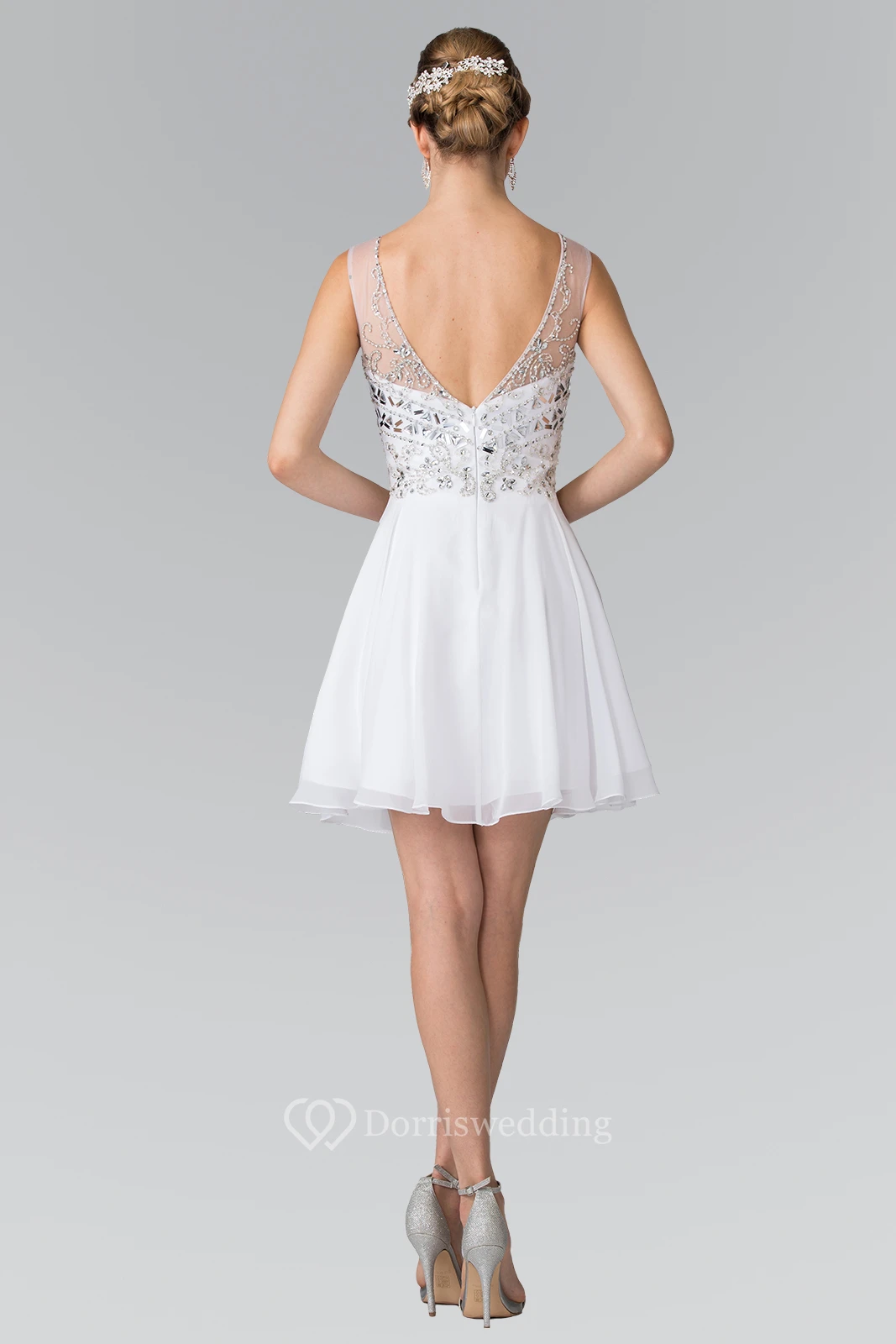A-Line Short V-Neck Empire Chiffon Low-V Back Dress With Beading And Pleats