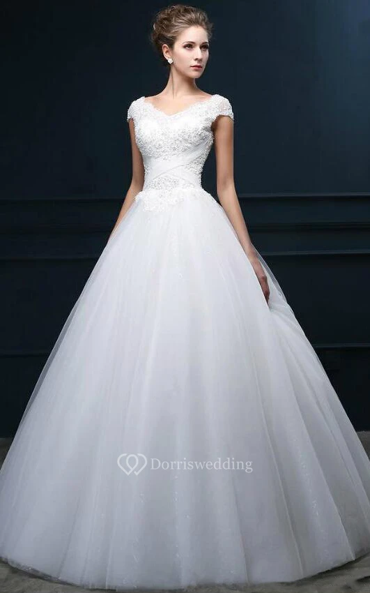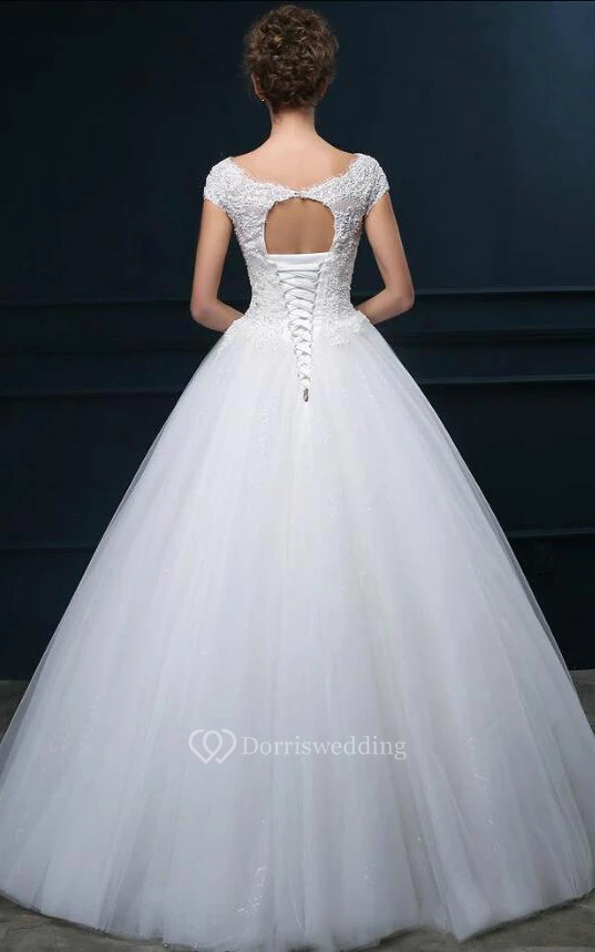 A-Line Short V-Neck Sleeveless Bell Cap Appliques Corset Back Tulle Lace Sequins Dress