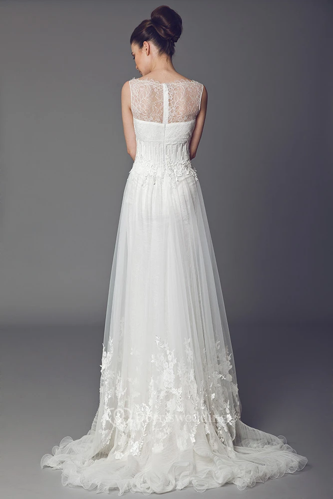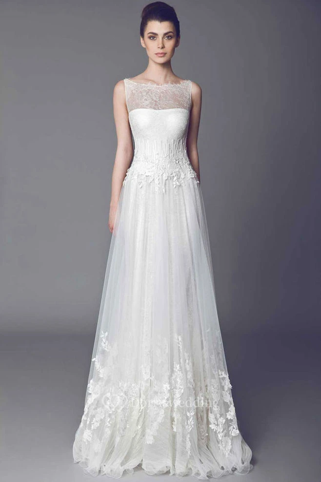 A-Line Sleeveless Appliqued Bateau Floor-Length Tulle Wedding Dress With Lace And Ruffles
