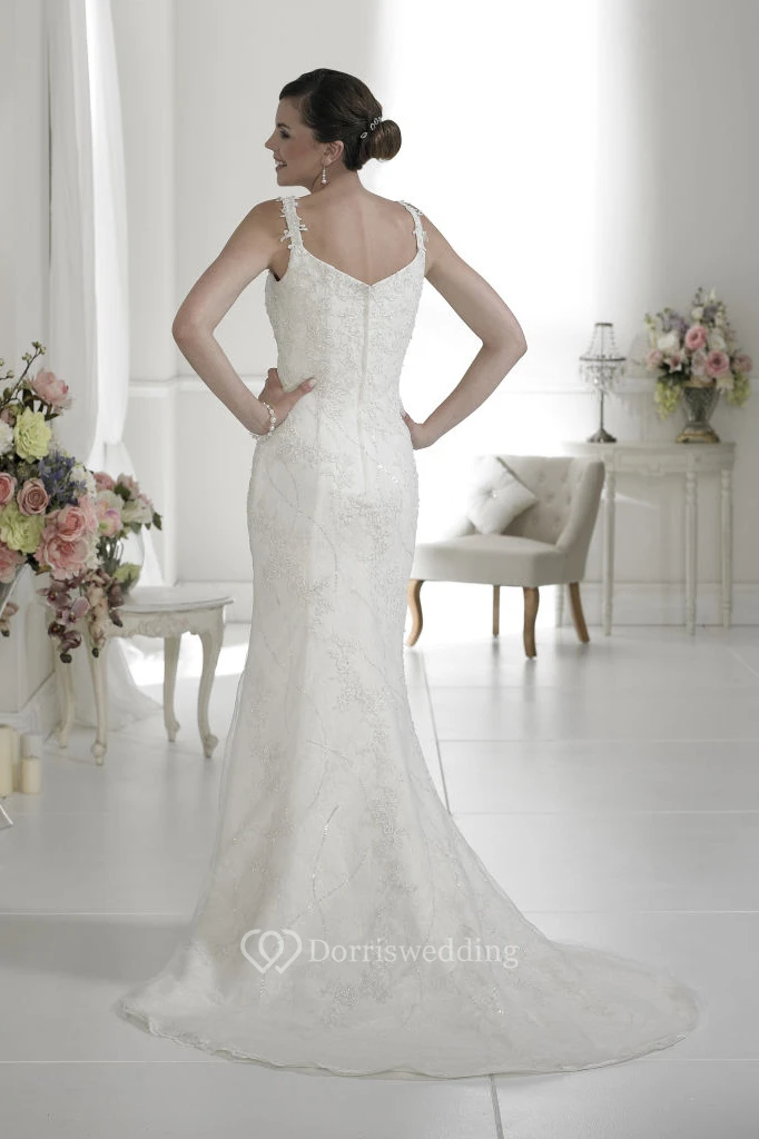 A-Line Sleeveless Appliqued Floor-Length Lace Wedding Dress With Low-V Back And Sweep Train