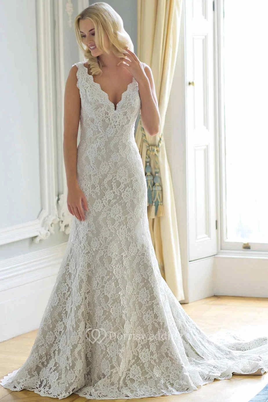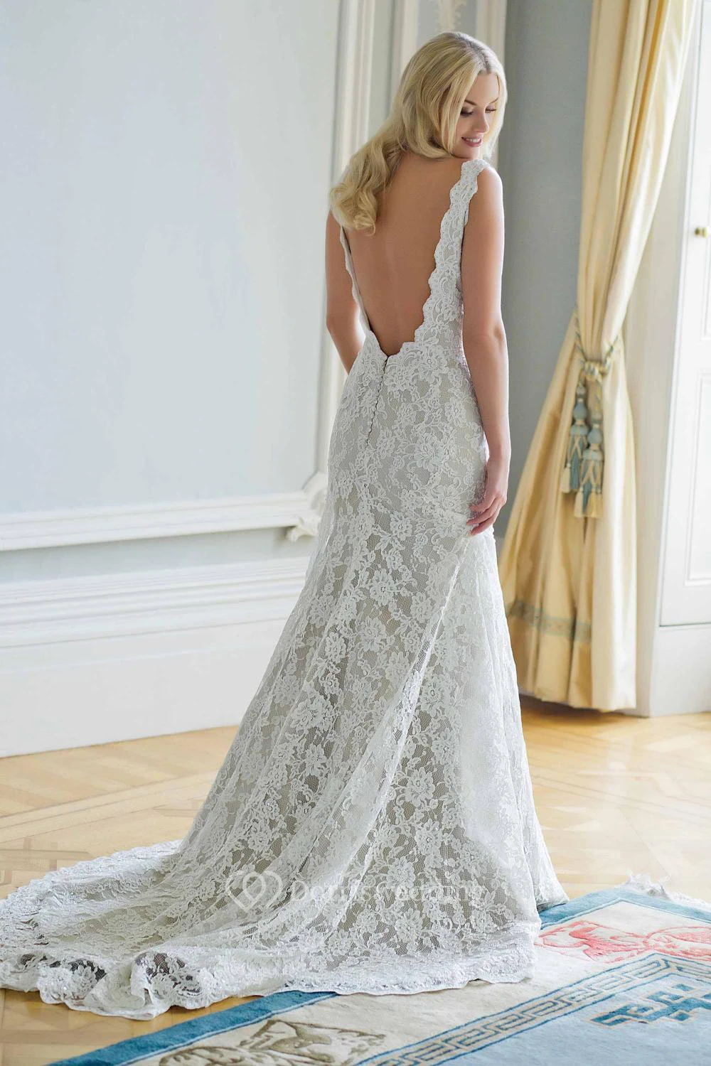 A-Line Sleeveless Appliqued Floor-Length V-Neck Lace Wedding Dress
