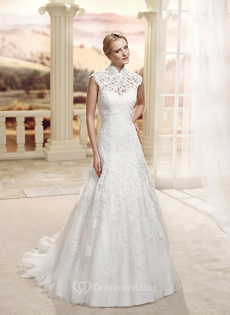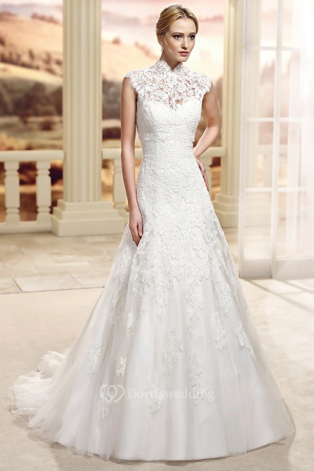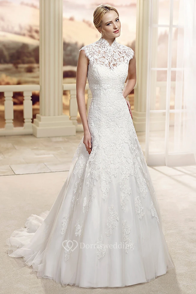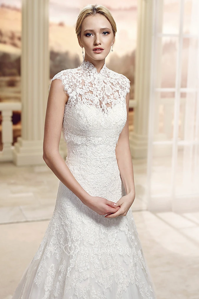 A-Line Sleeveless Appliqued High-Neck Floor-Length Lace Wedding Dress