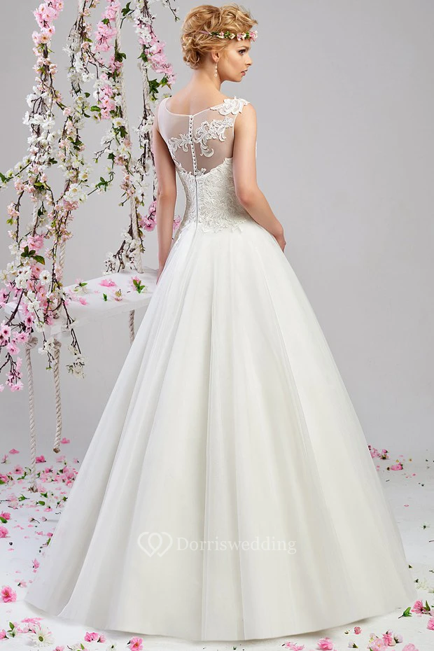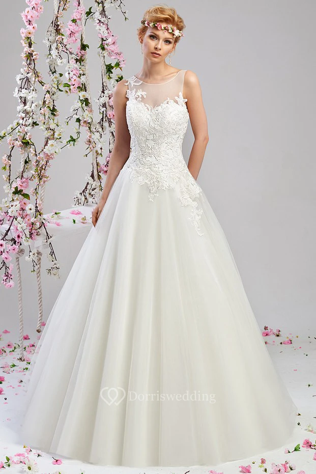 A-Line Sleeveless Appliqued Maxi Scoop-Neck Tulle&Satin Wedding Dress