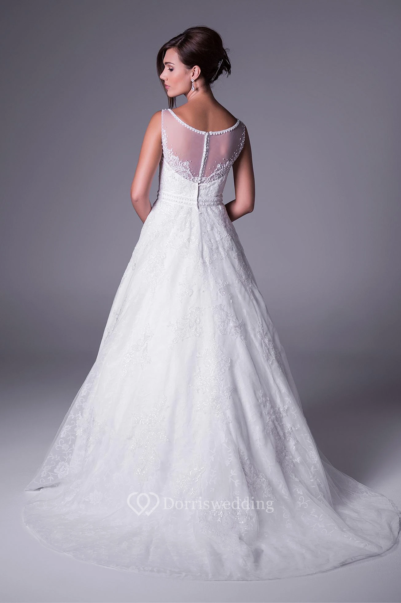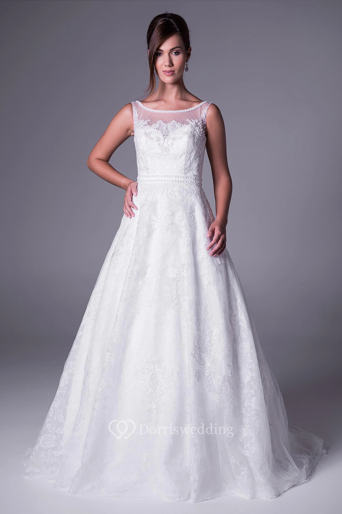 A-Line Sleeveless Bateau-Neck Appliqued Long Lace Wedding Dress With Waist Jewellery