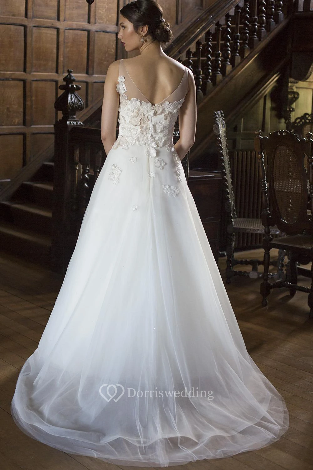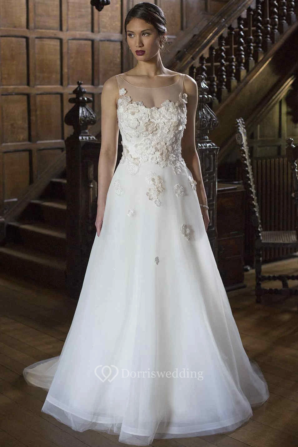 A-Line Sleeveless Bateau-Neck Floral Floor-Length Organza&Tulle Wedding Dress With Appliques
