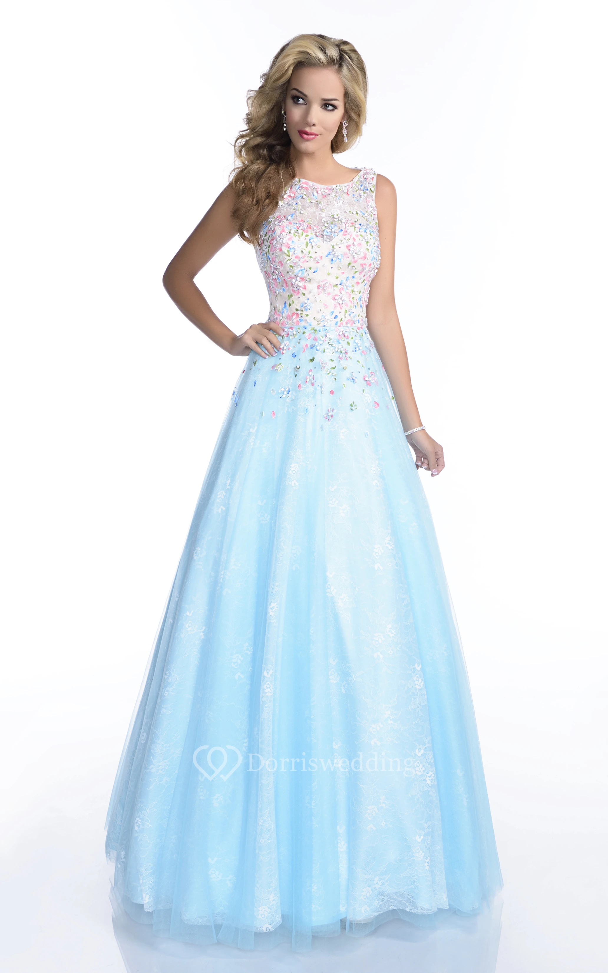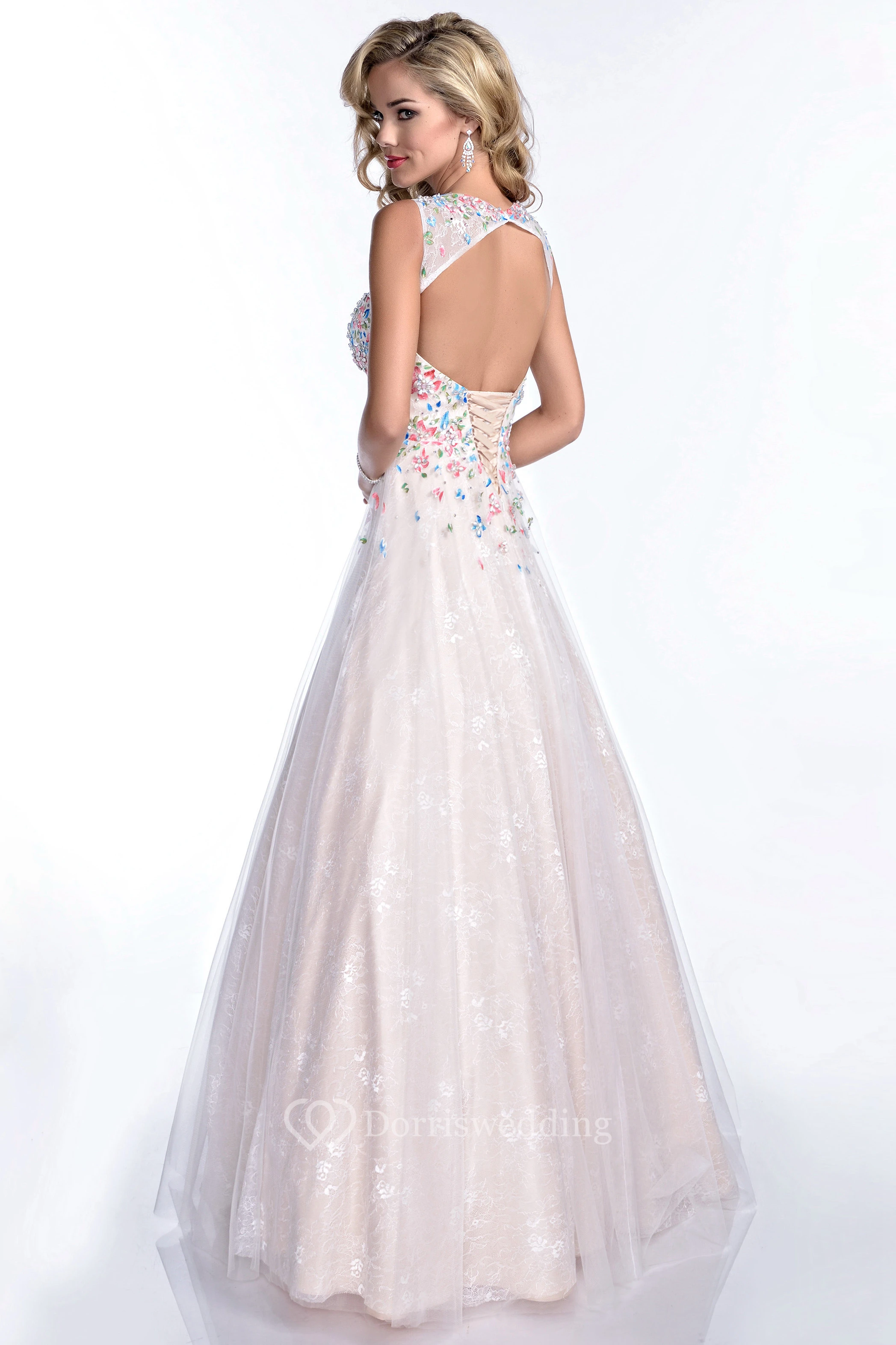 A-Line Sleeveless Bateau Neck Lace Prom Dress Featuring Keyhole Back And Jewels