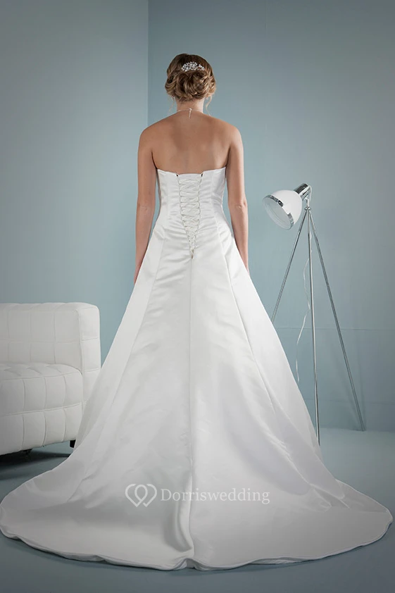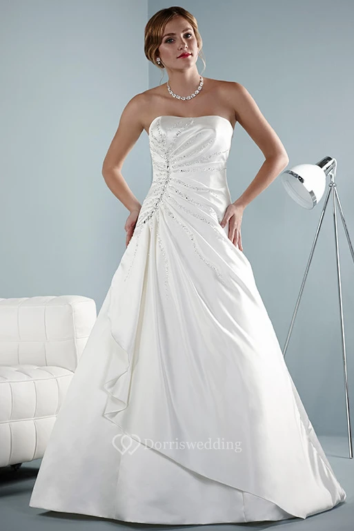 A-Line Sleeveless Beaded Floor-Length Strapless Satin Wedding Dress With Lace-Up Back And Side Draping