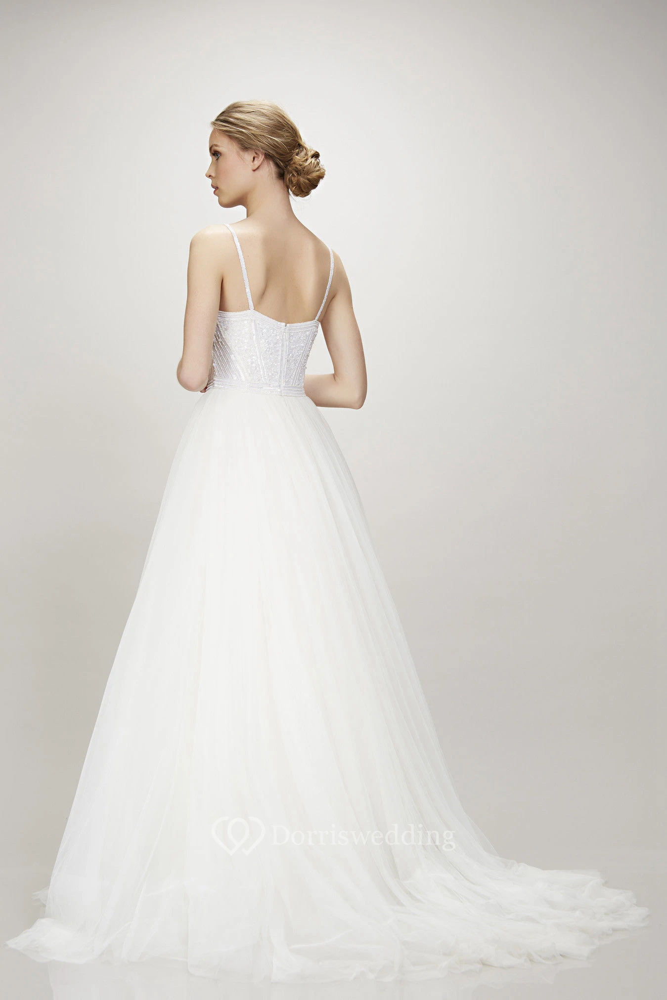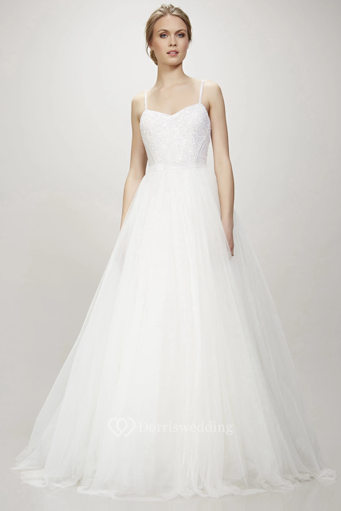 A-Line Sleeveless Beaded Long Spaghetti Tulle Wedding Dress With Zipper Back And Ruffles