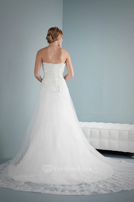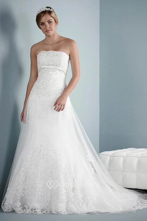 A-Line Sleeveless Beaded Maxi Strapless Tulle Wedding Dress With Lace-Up Back And Appliques
