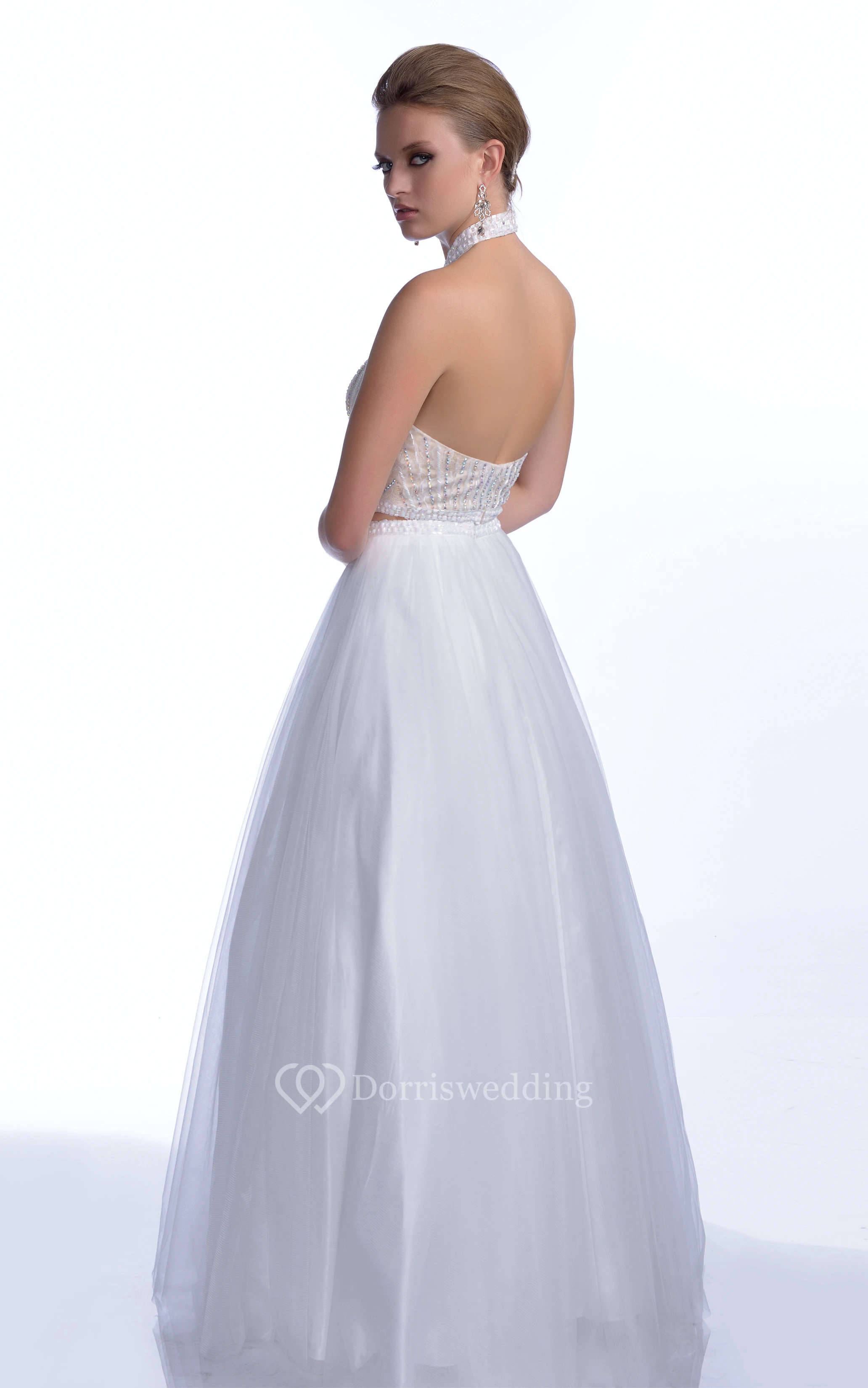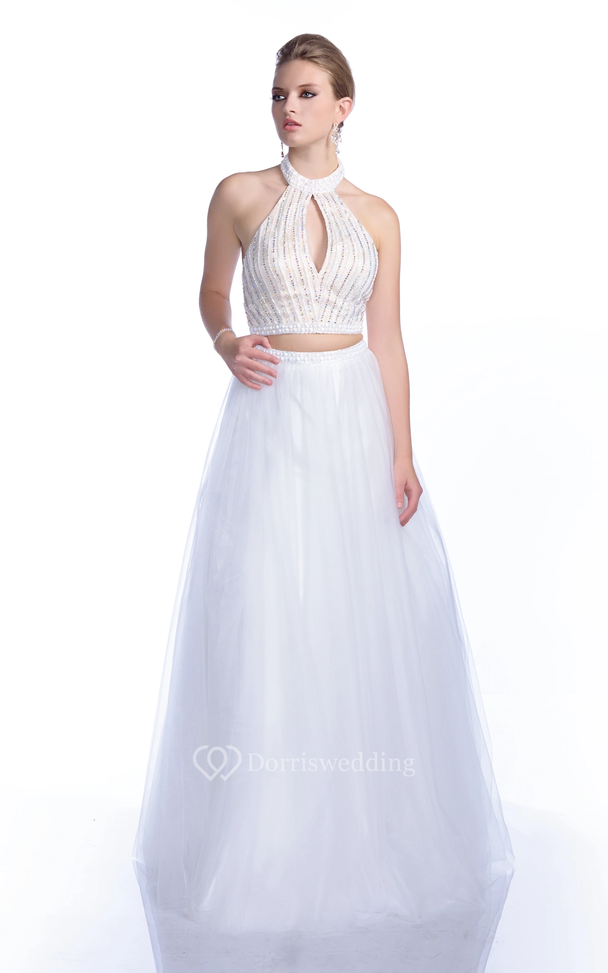 A-Line Sleeveless Crop Top Tulle Prom Dress With Halter And Crystal Bodice