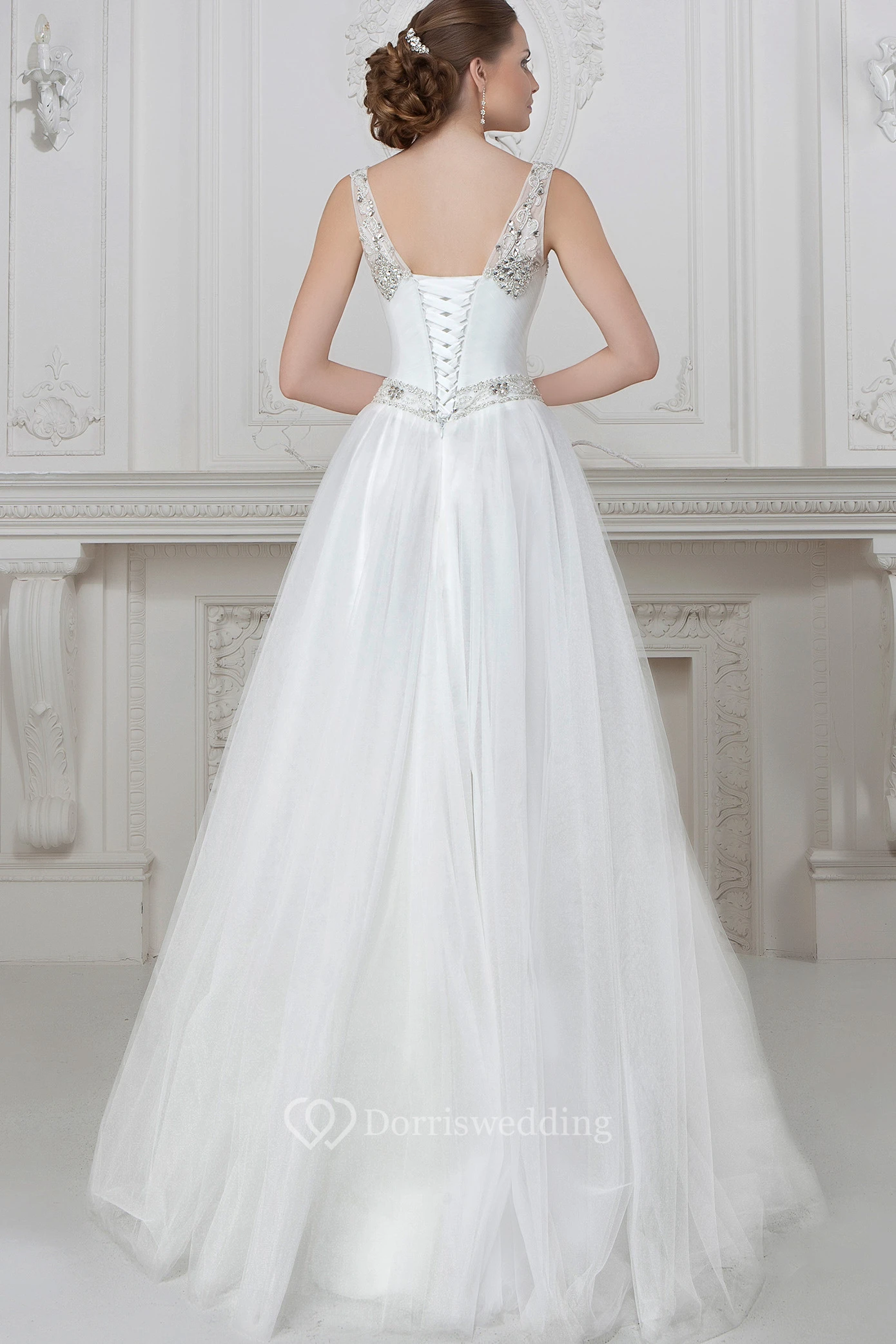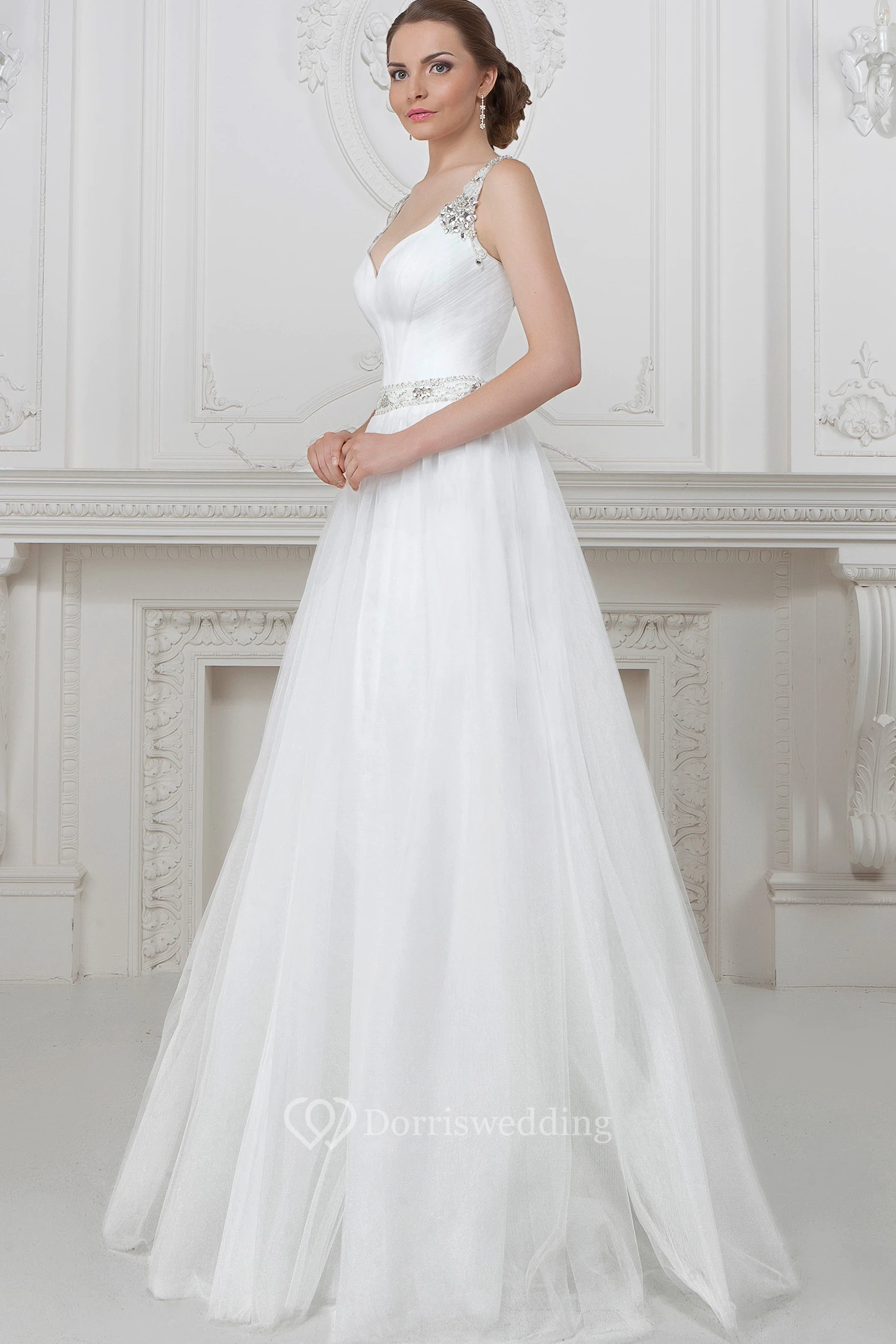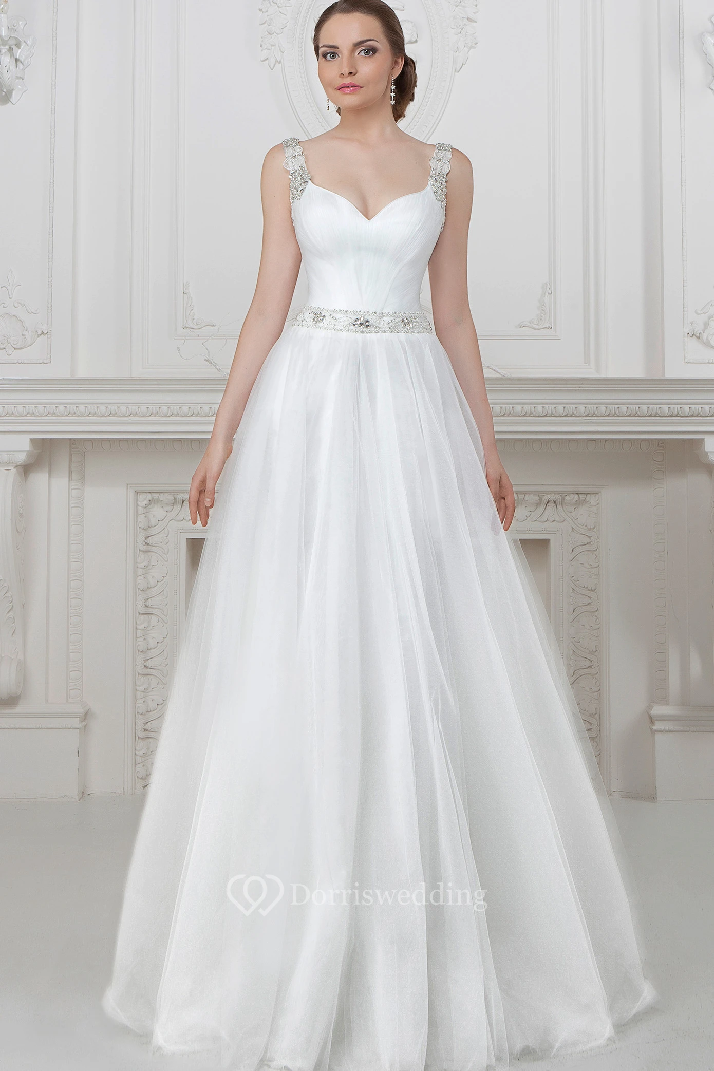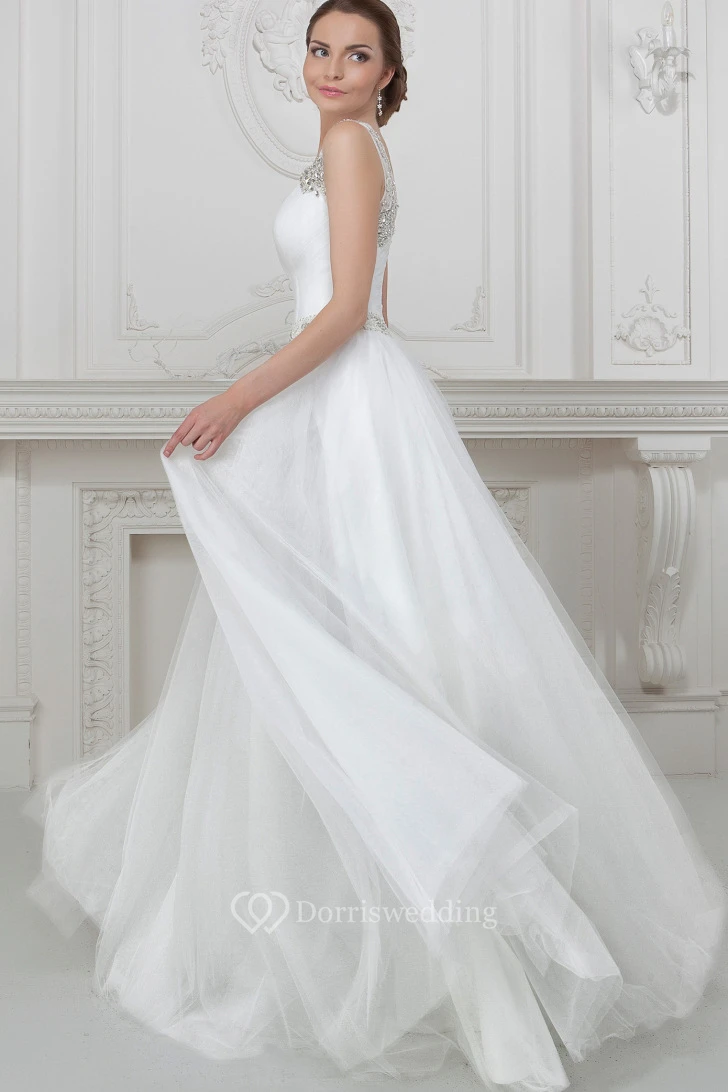 A-Line Sleeveless Floor-Length Beaded Tulle Wedding Dress With Waist Jewellery And Pleats