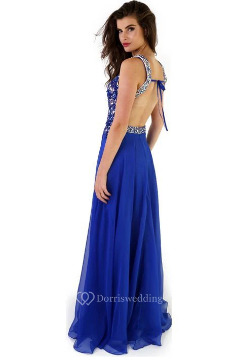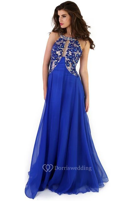 A-Line Sleeveless Floor-Length Crystal Scoop Chiffon Prom Dress With Backless Style And Pleats
