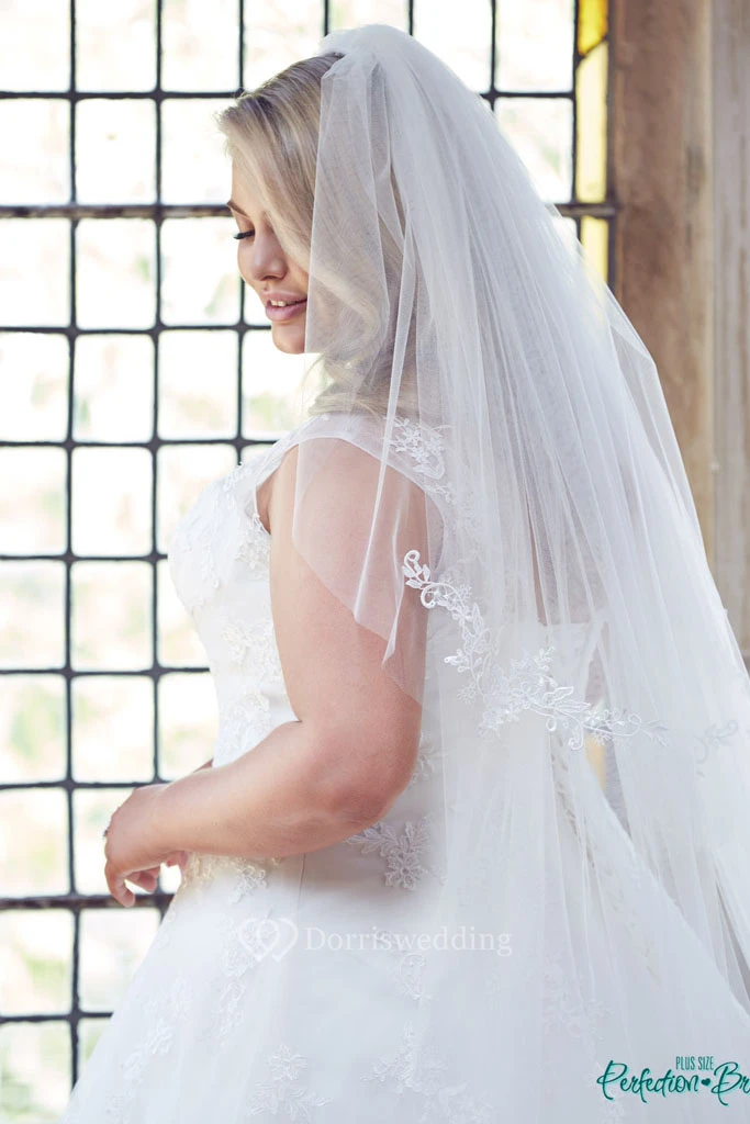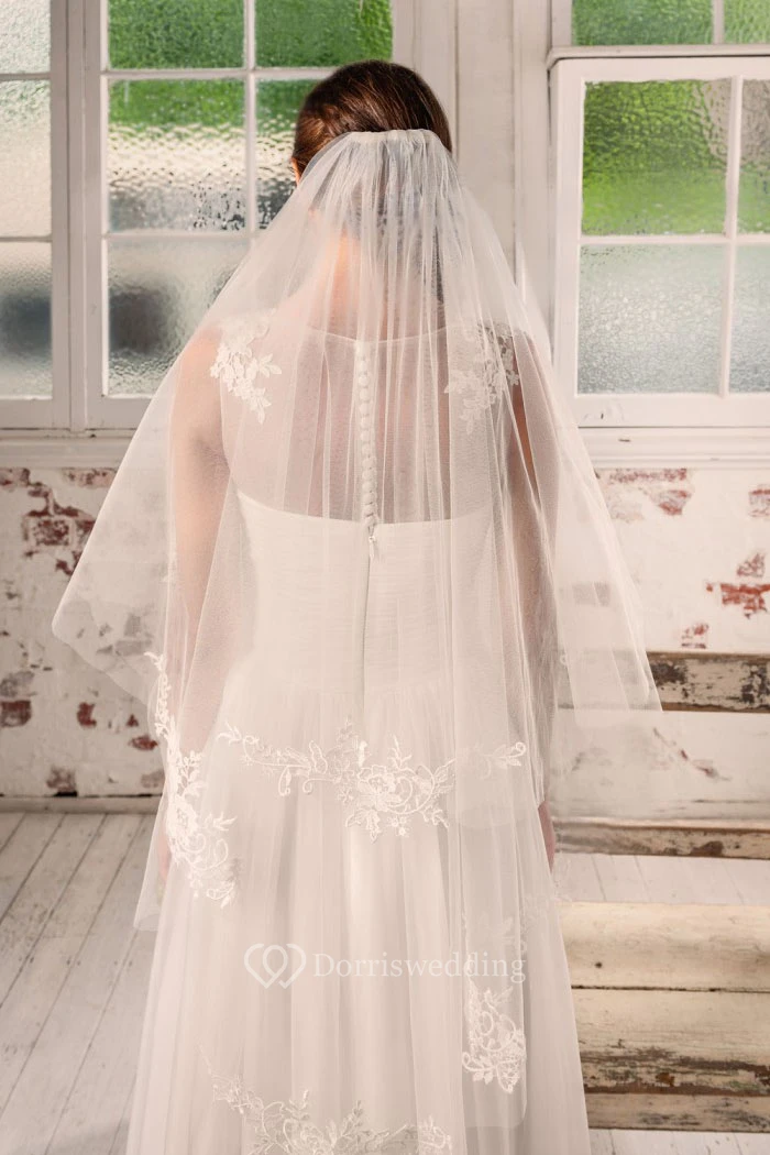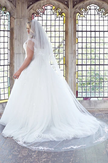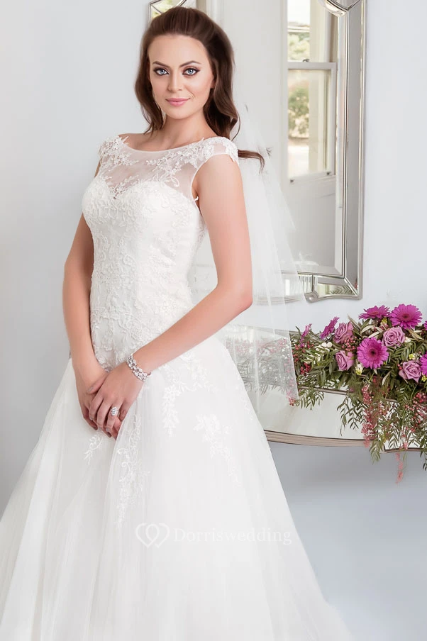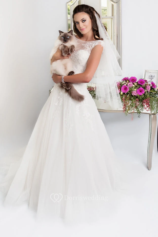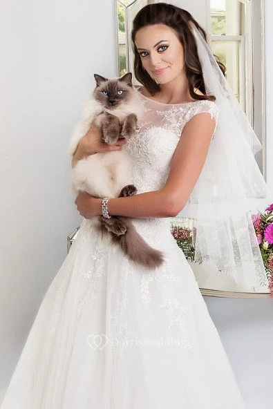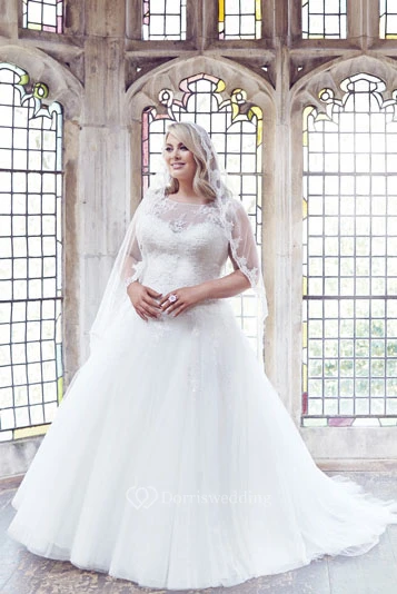 A-Line Sleeveless Floor-Length Scoop Appliqued Tulle Wedding Dress With Court Train And Illusion Back