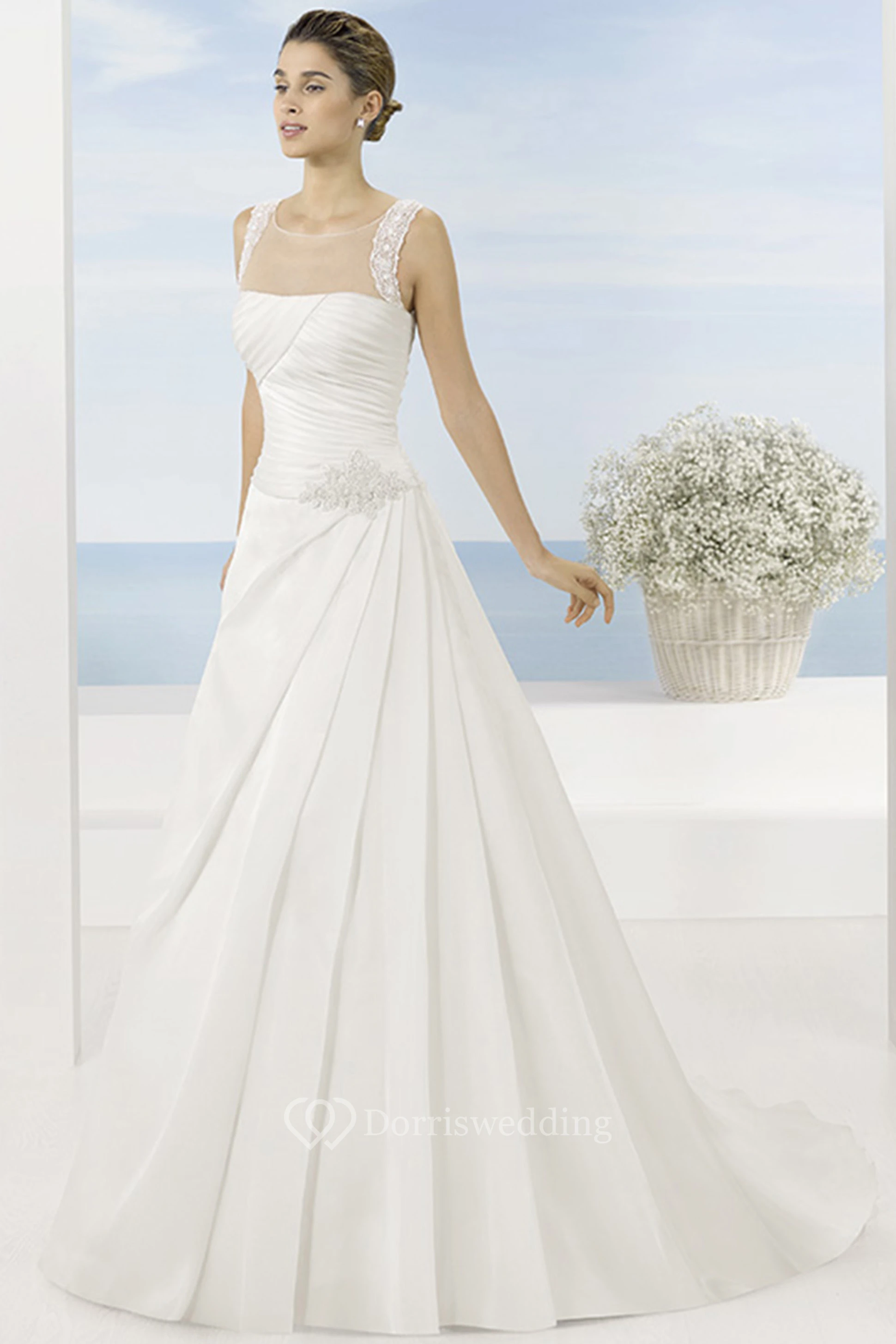 A-Line Sleeveless Floor-Length Scoop Draped Satin Wedding Dress With Beading And Waist Jewellery