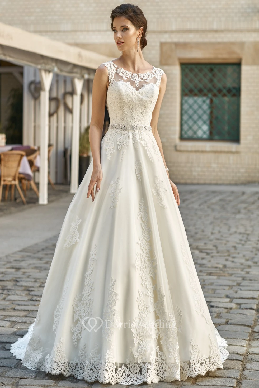 A-Line Sleeveless Floor-Length Scoop-Neck Appliqued Lace&Satin Wedding Dress With Waist Jewellery