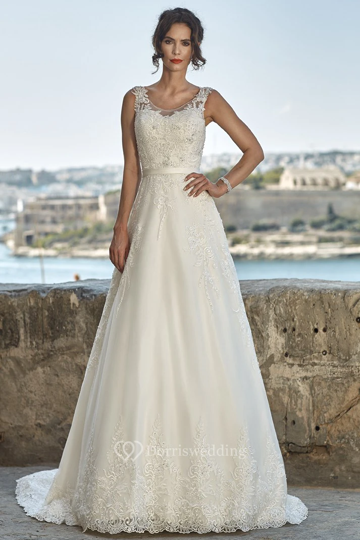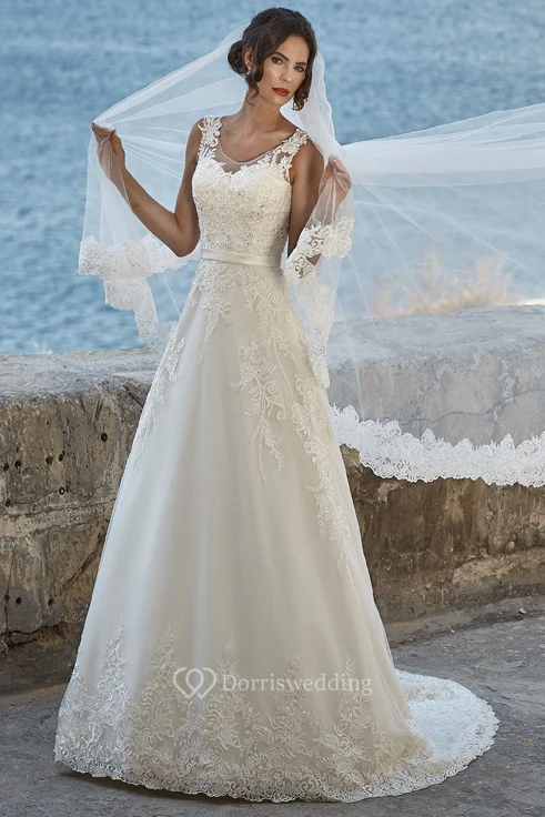 A-Line Sleeveless Floor-Length Scoop-Neck Appliqued Lace Wedding Dress