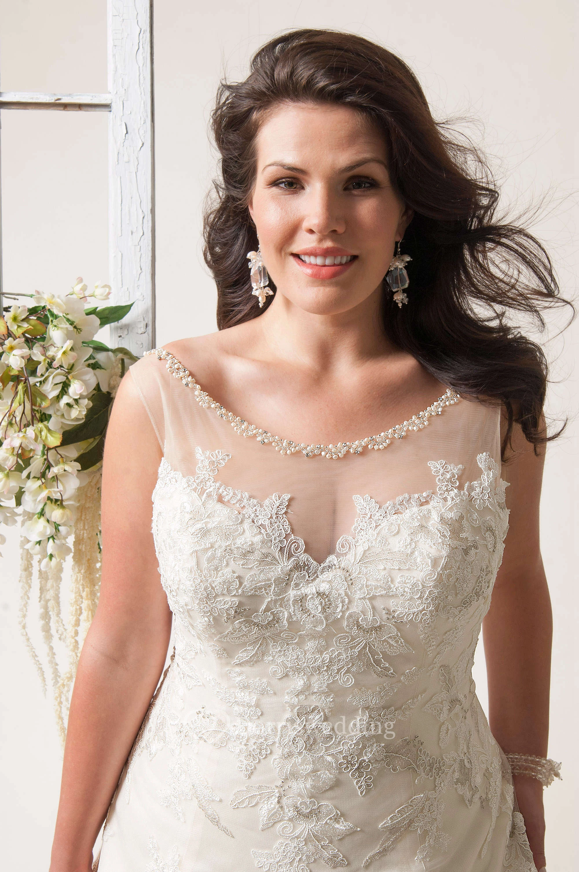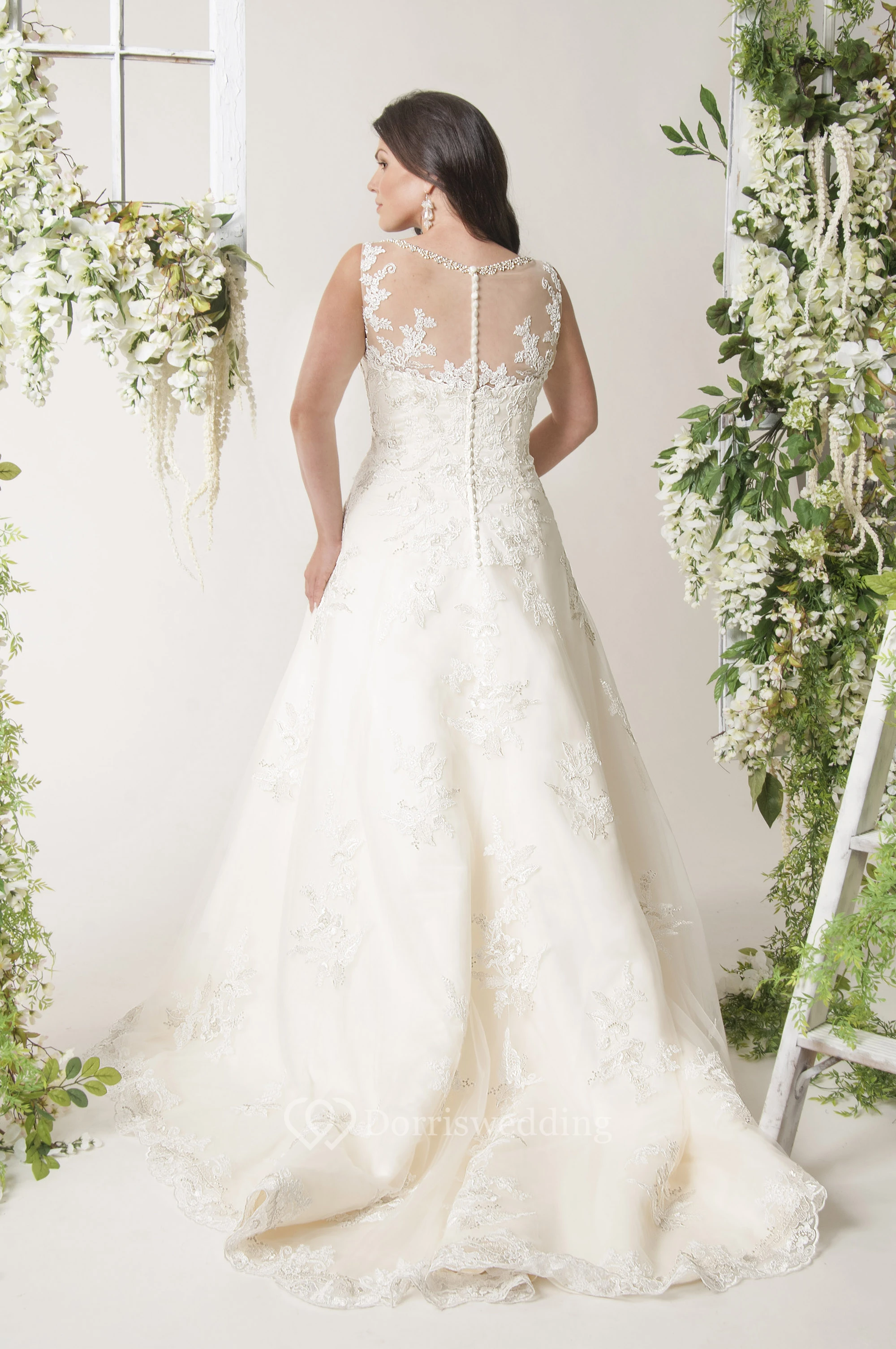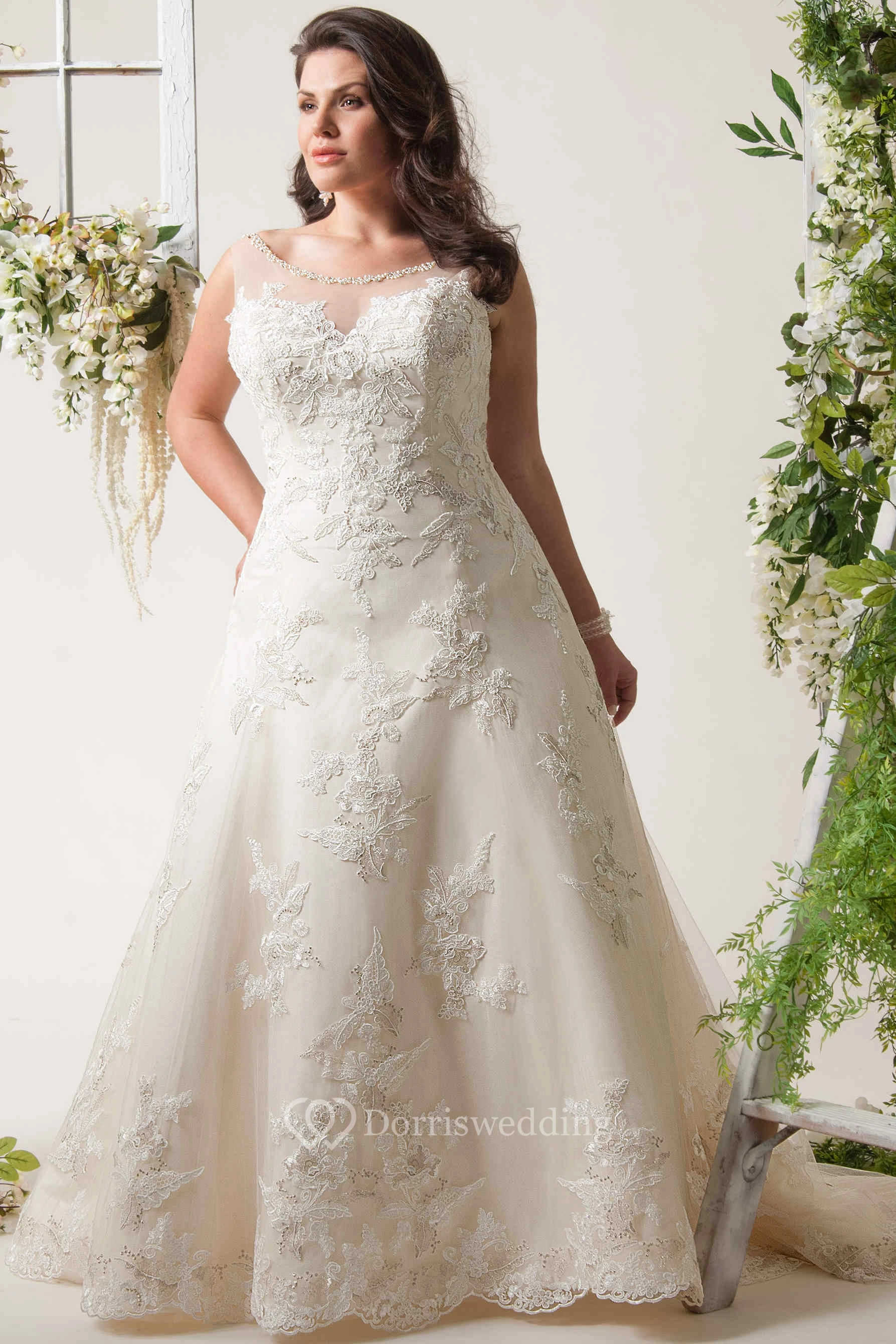 A-Line Sleeveless Floor-Length Scoop-Neck Lace Plus Size Wedding Dress With Appliques And Illusion