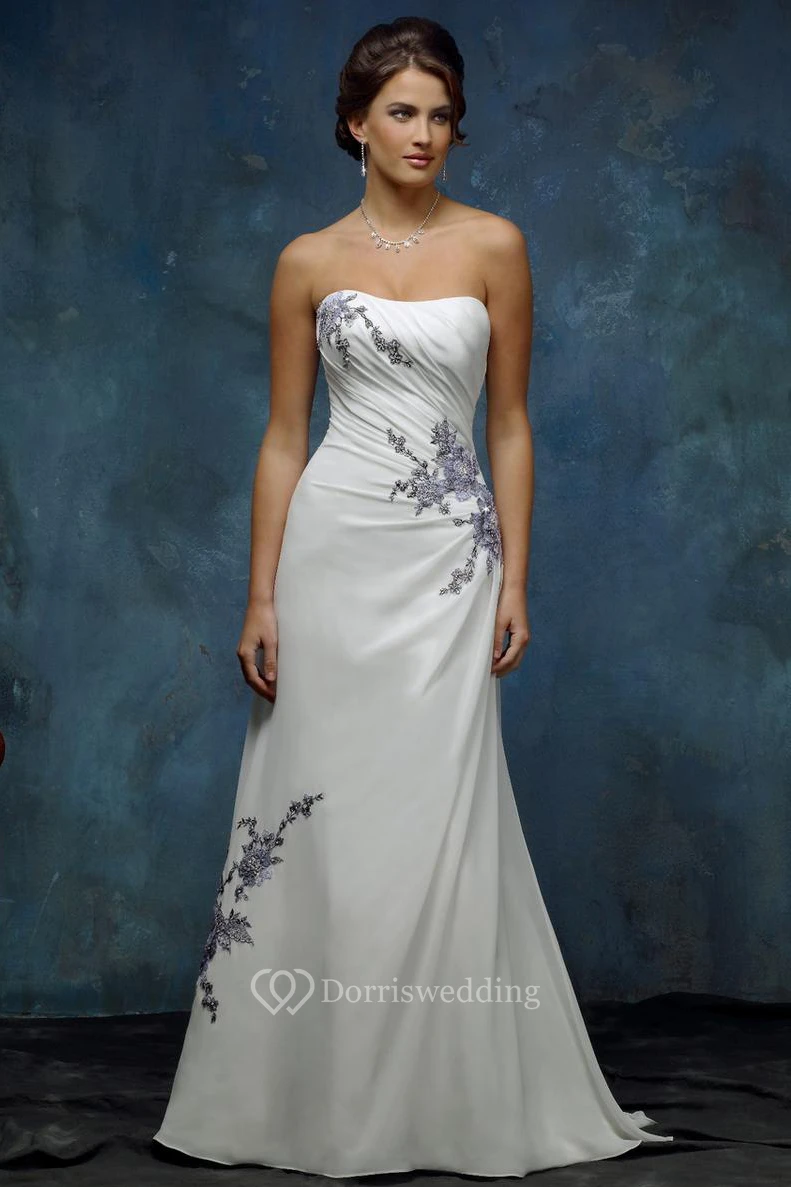 A-Line Sleeveless Floor-Length Side-Draped Strapless Chiffon Wedding Dress With Appliques And Corset Back