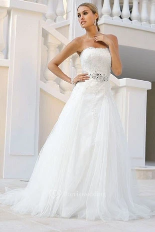 A-Line Sleeveless Floor-Length Strapless Appliqued Tulle Wedding Dress With Waist Jewellery