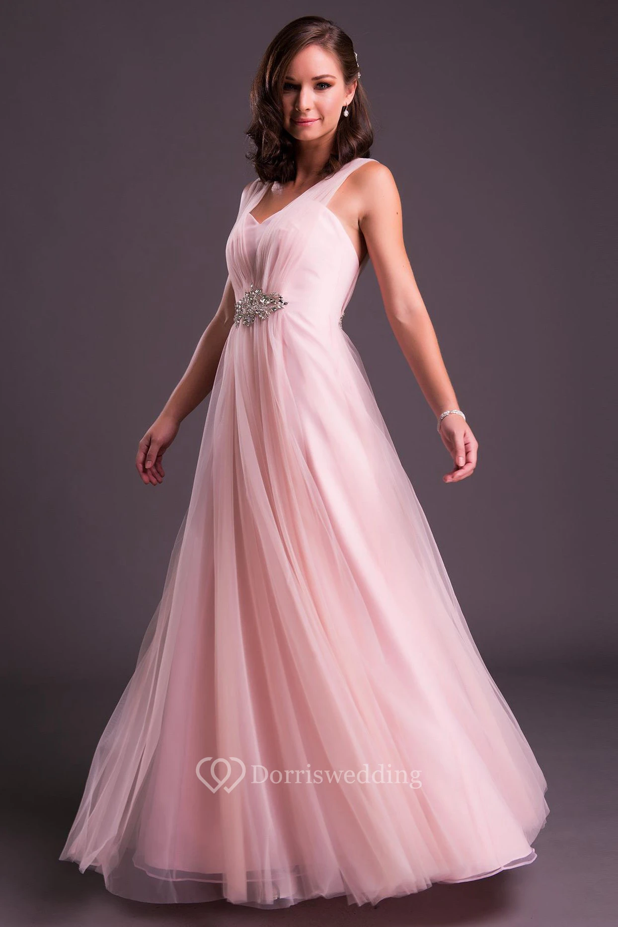 A-Line Sleeveless Floor-Length V-Neck Jeweled Tulle Prom Dress With Pleats