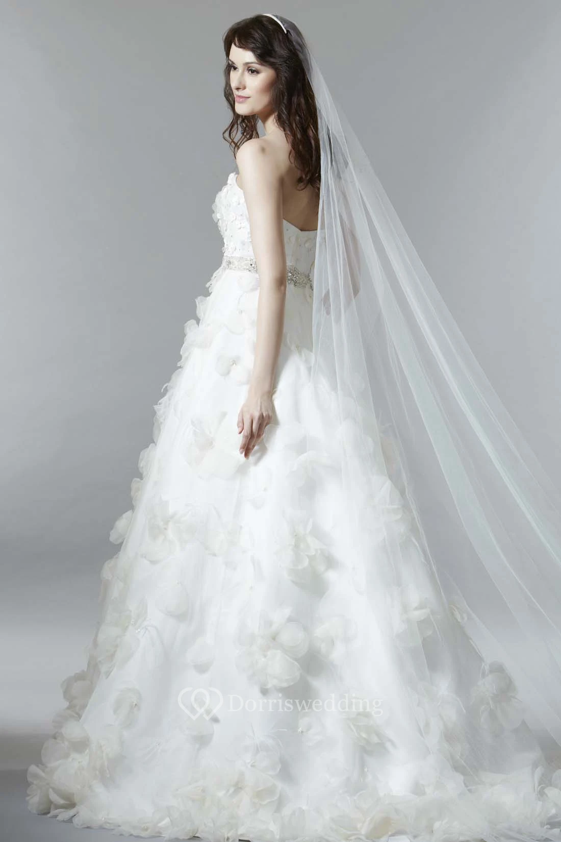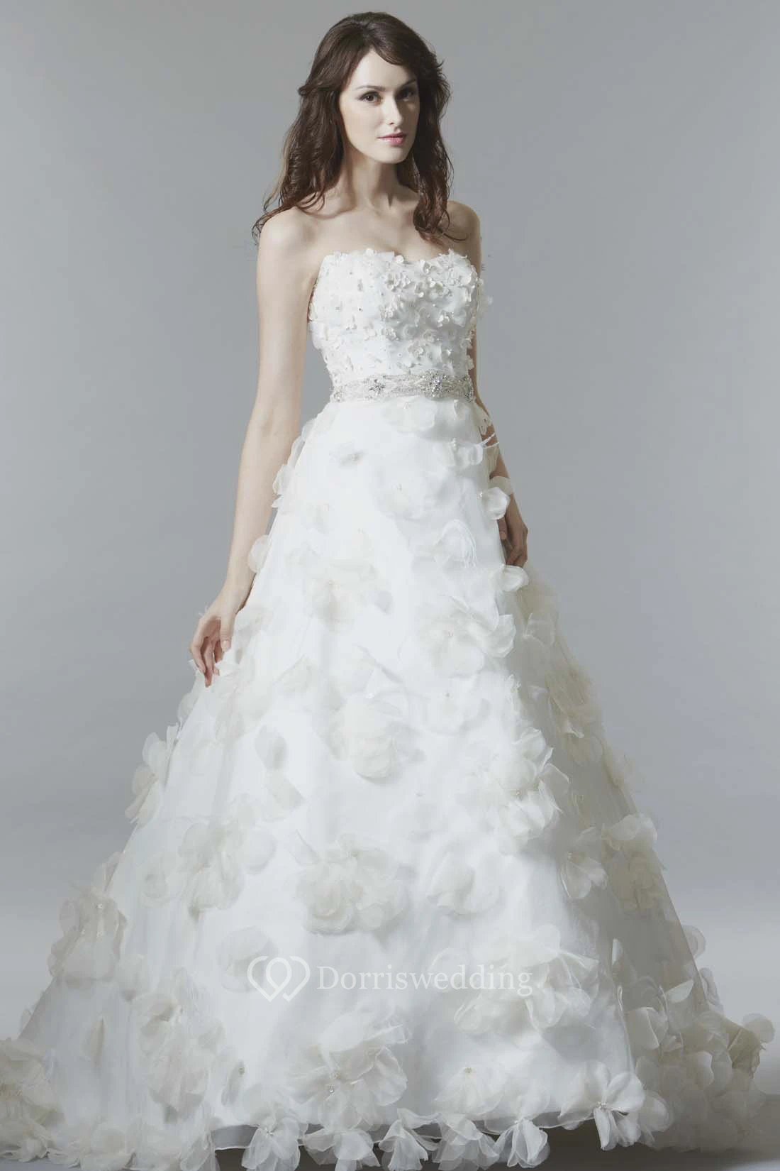 A-Line Sleeveless Floral Long Strapless Satin Wedding Dress With Low-V Back And Waist Jewellery
