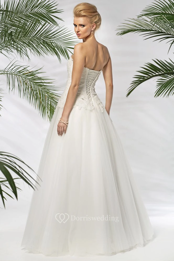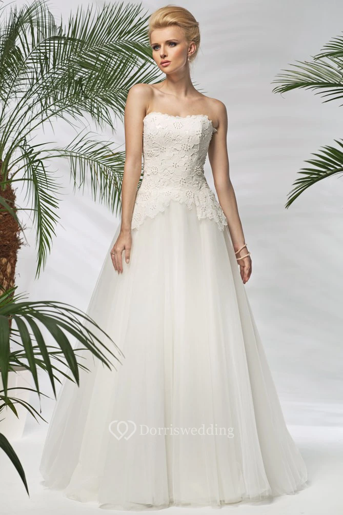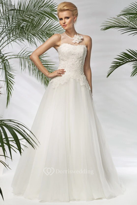 A-Line Sleeveless Floral Long Strapless Tulle Wedding Dress With Beading And Appliques