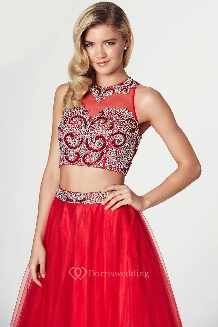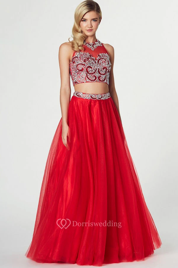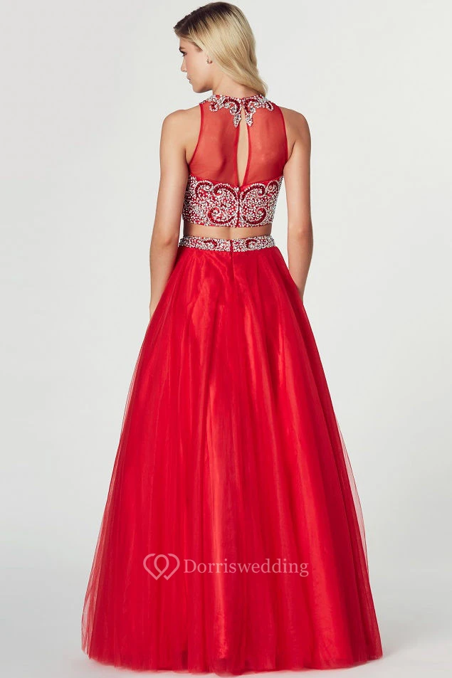 A-Line Sleeveless High Neck Beaded Tulle Prom Dress With Illusion Back