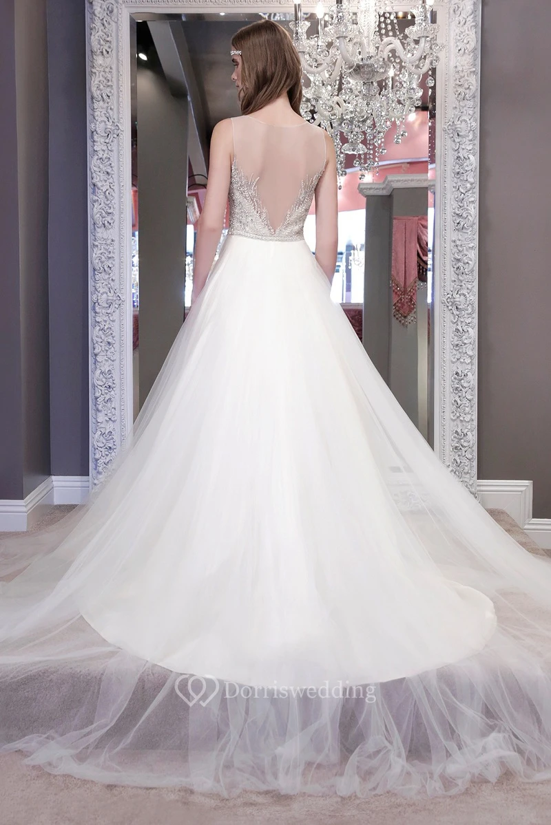 A-Line Sleeveless Jewel-Neck Tulle Wedding Dress With Crystal Detailing And Illusion