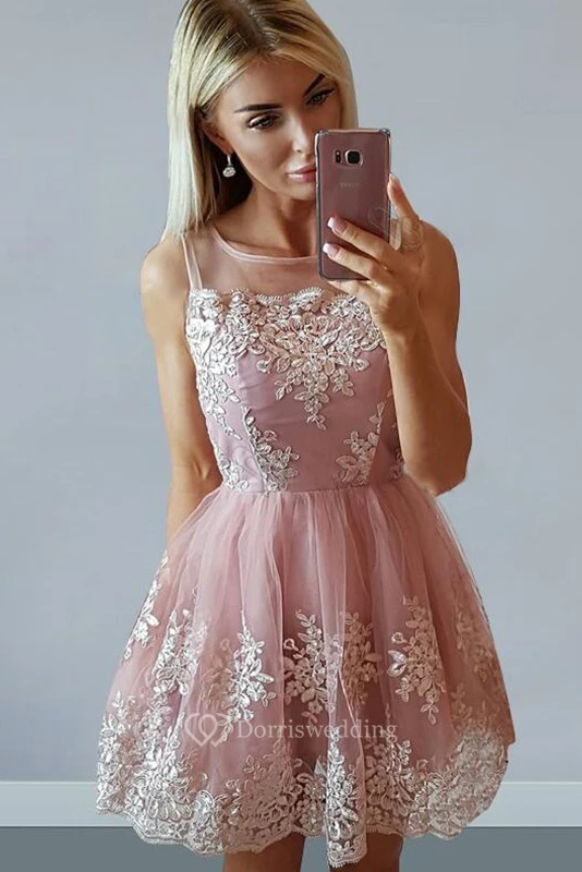 A-line Sleeveless Lace Bateau Zipper Short Mini Homecoming Dress