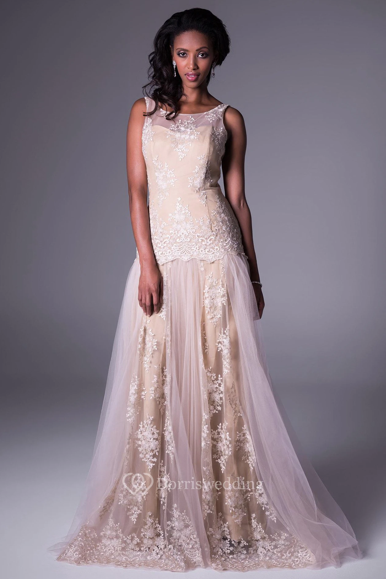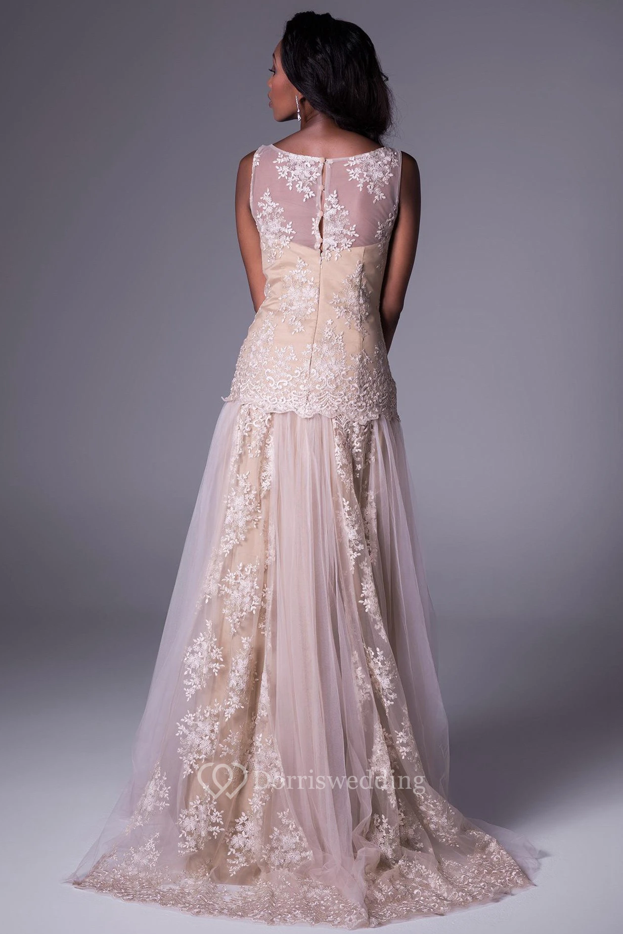 A-Line Sleeveless Long Appliqued Scoop-Neck Tulle&Lace Prom Dress