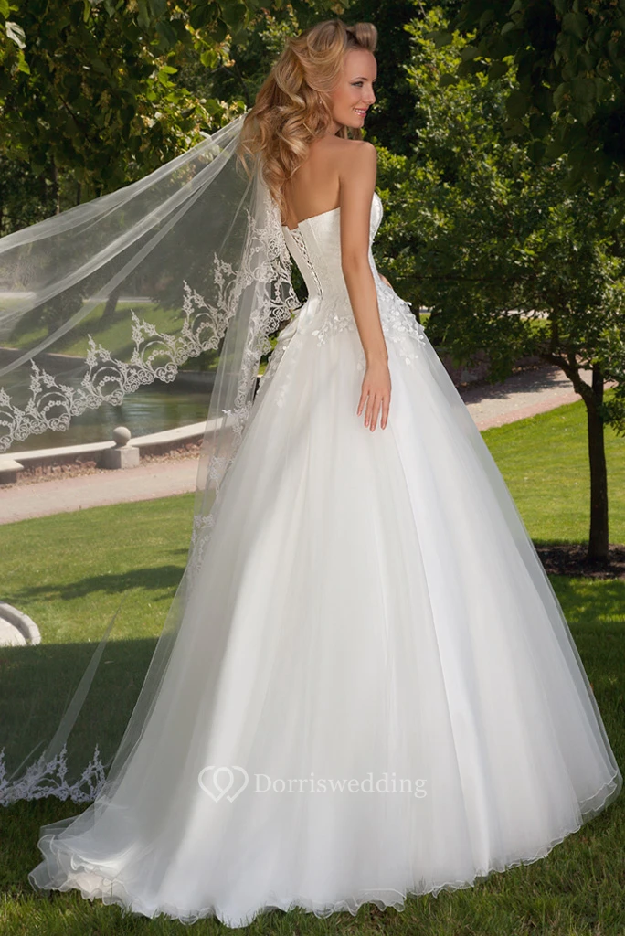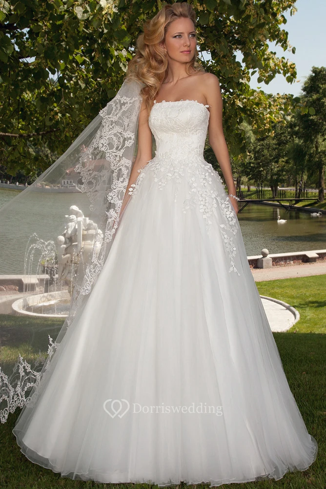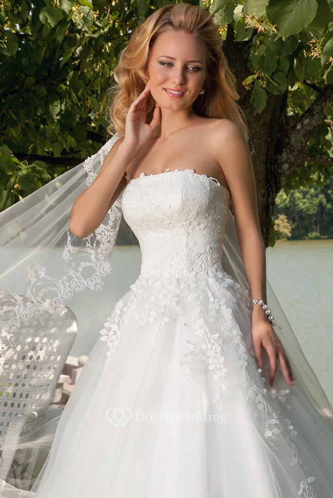 A-Line Sleeveless Long Appliqued Strapless Tulle Wedding Dress With Corset Back And Bow