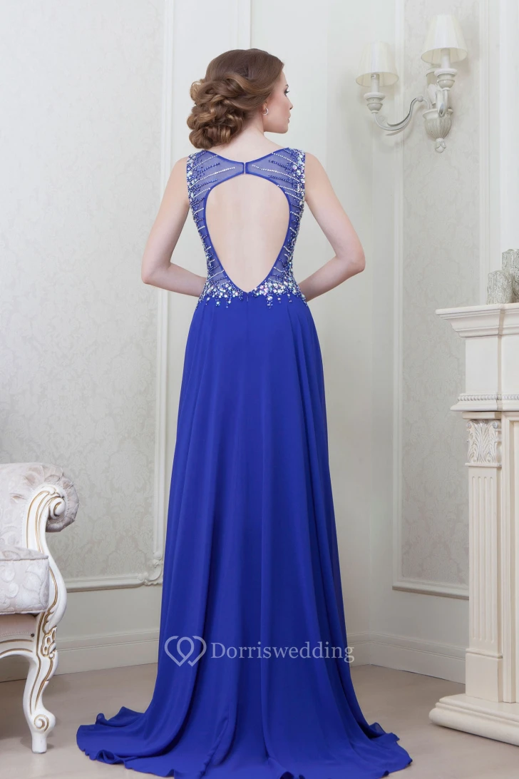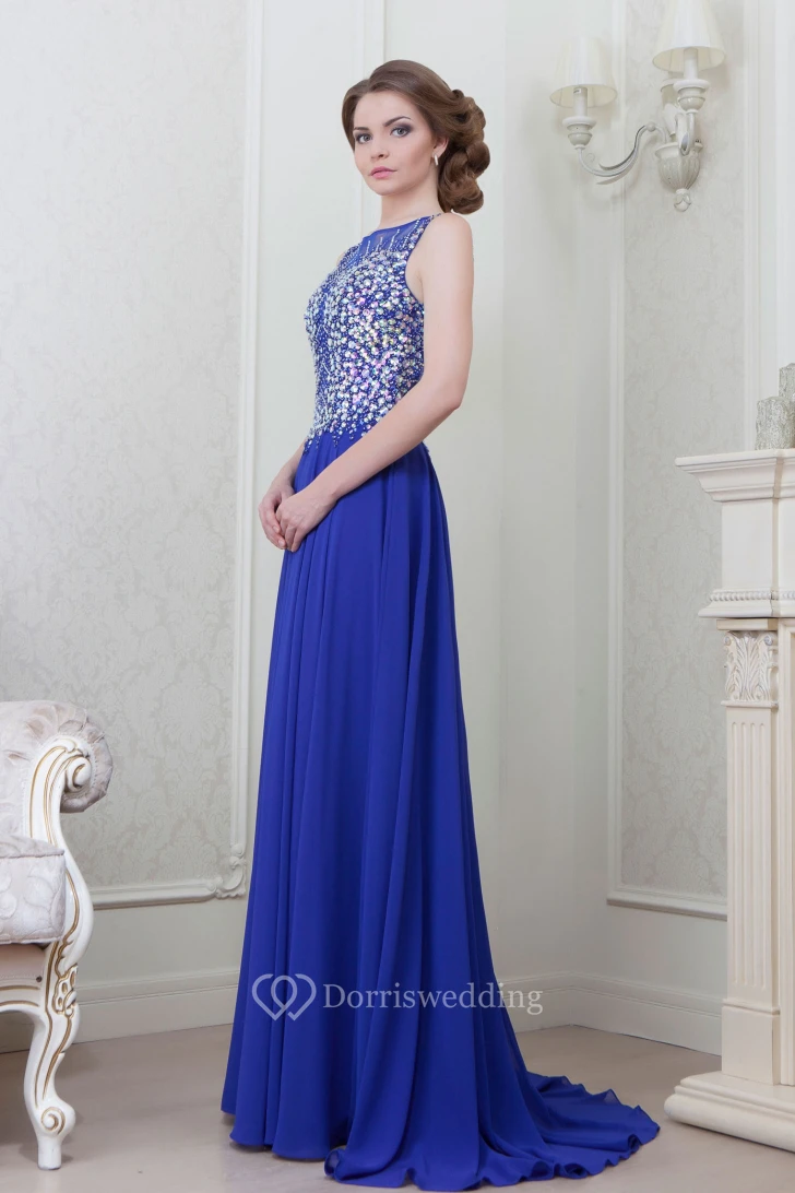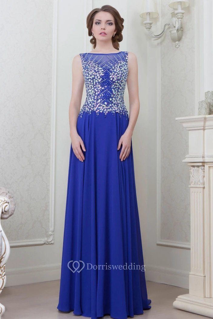 A-Line Sleeveless Long Crystal Bateau-Neck Chiffon Evening Dress With Pleats