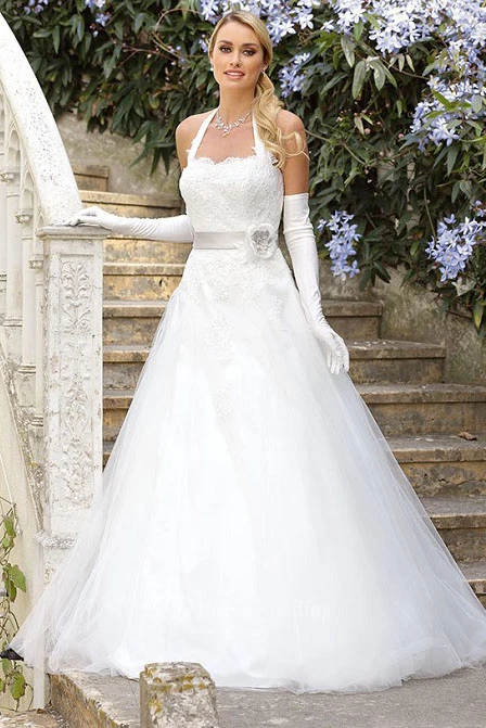 A-Line Sleeveless Long Halter Appliqued Tulle Wedding Dress With Flower