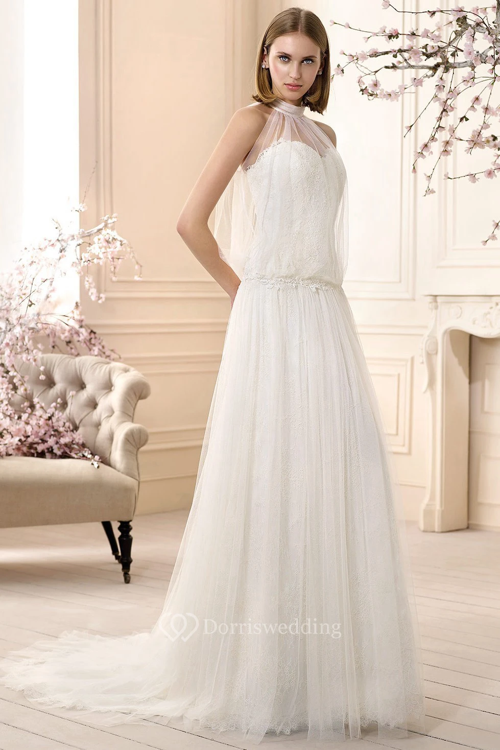 A-Line Sleeveless Long High-Neck Lace Tulle Wedding Dress
