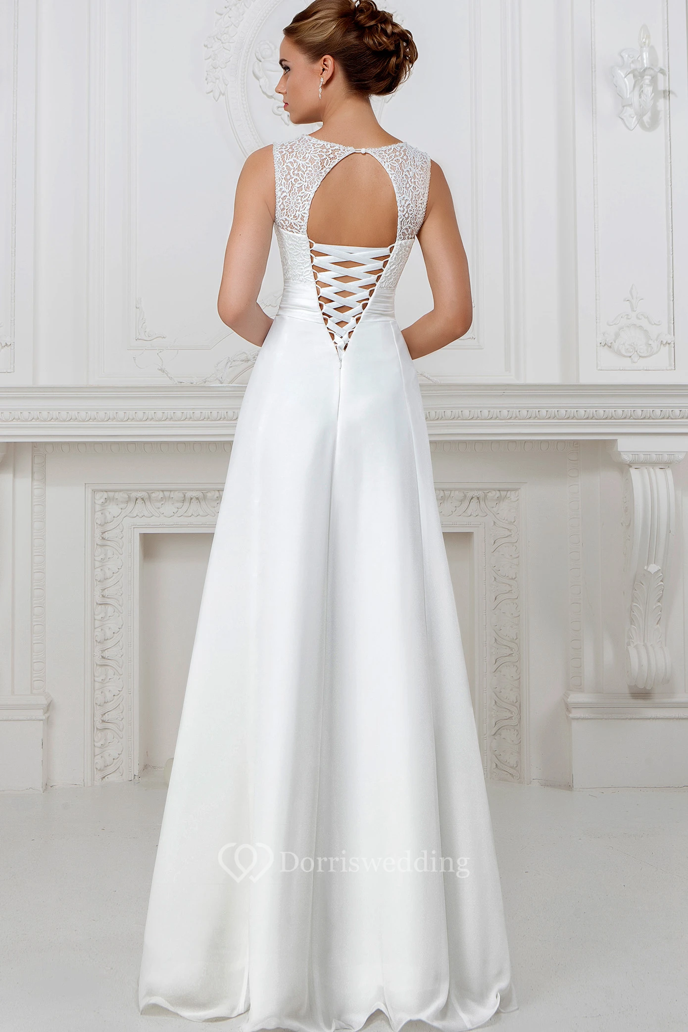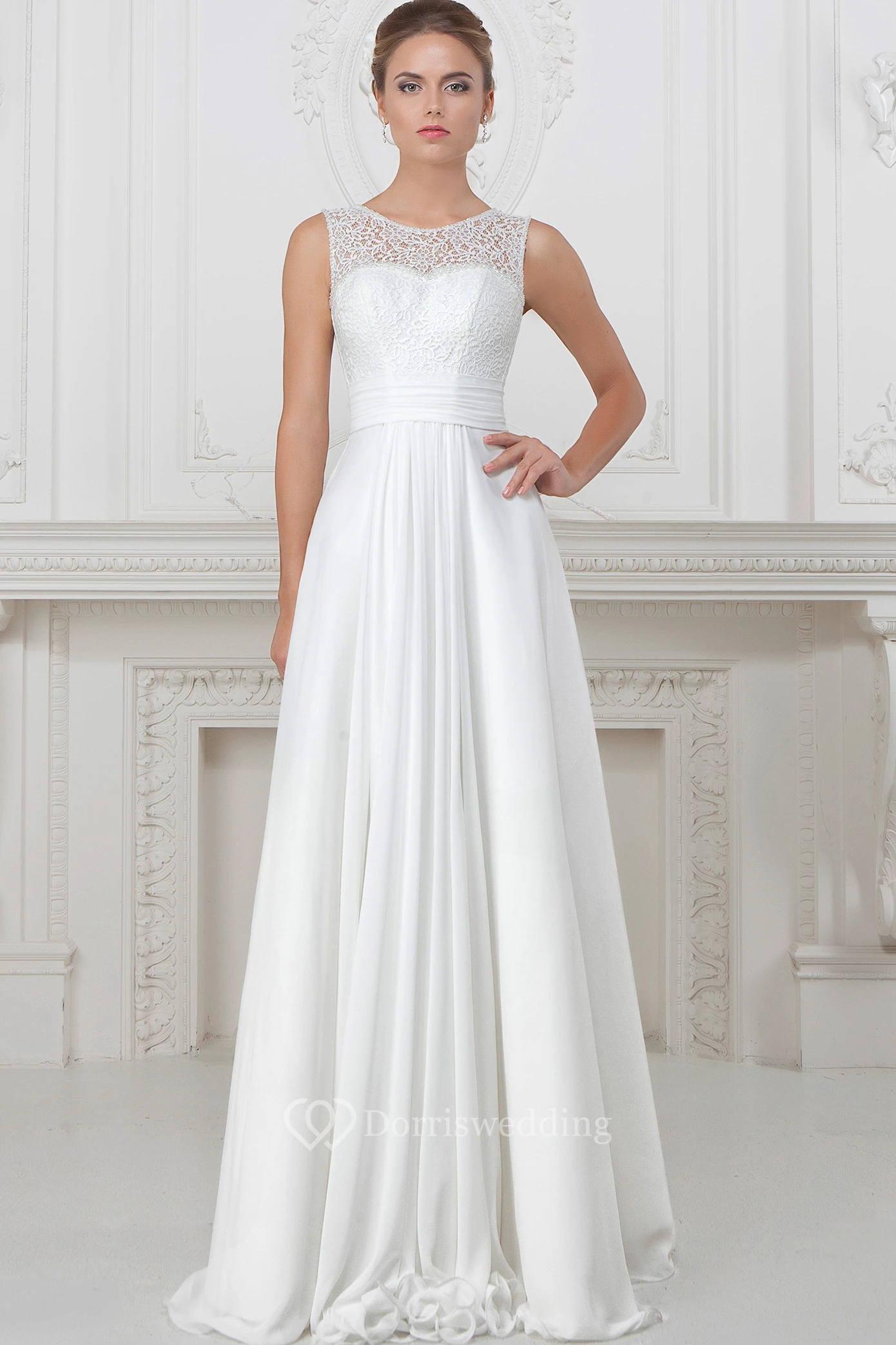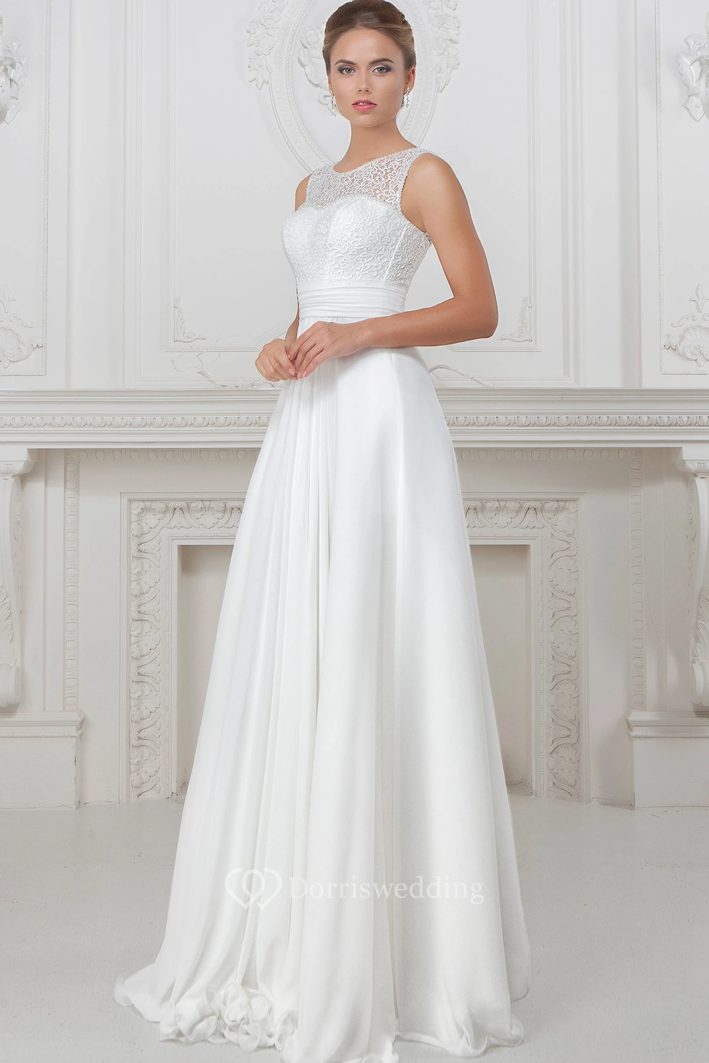 A-Line Sleeveless Long Lace Scoop-Neck Wedding Dress With Pleats