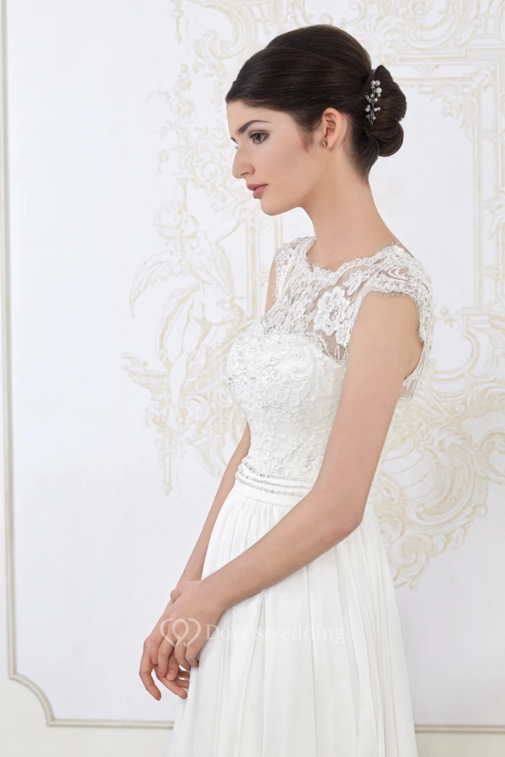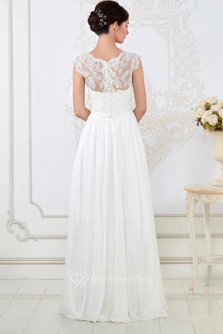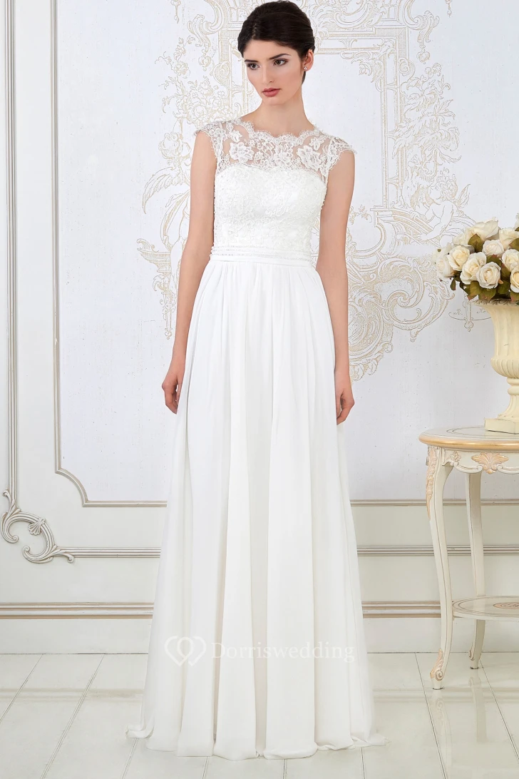 A-Line Sleeveless Long Scoop-Neck Appliqued Wedding Dress With Pleats
