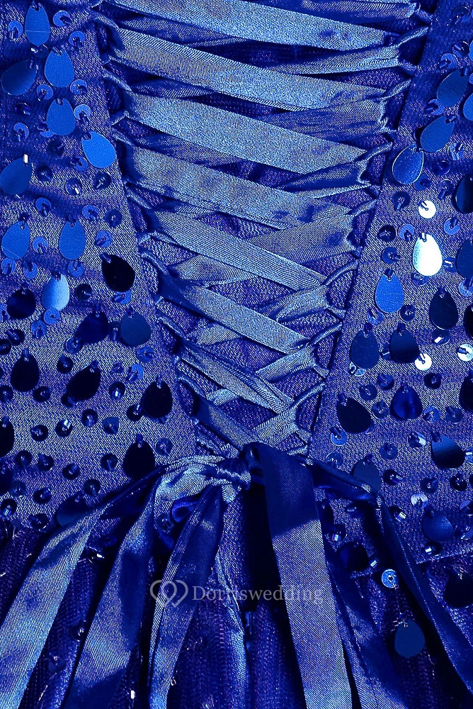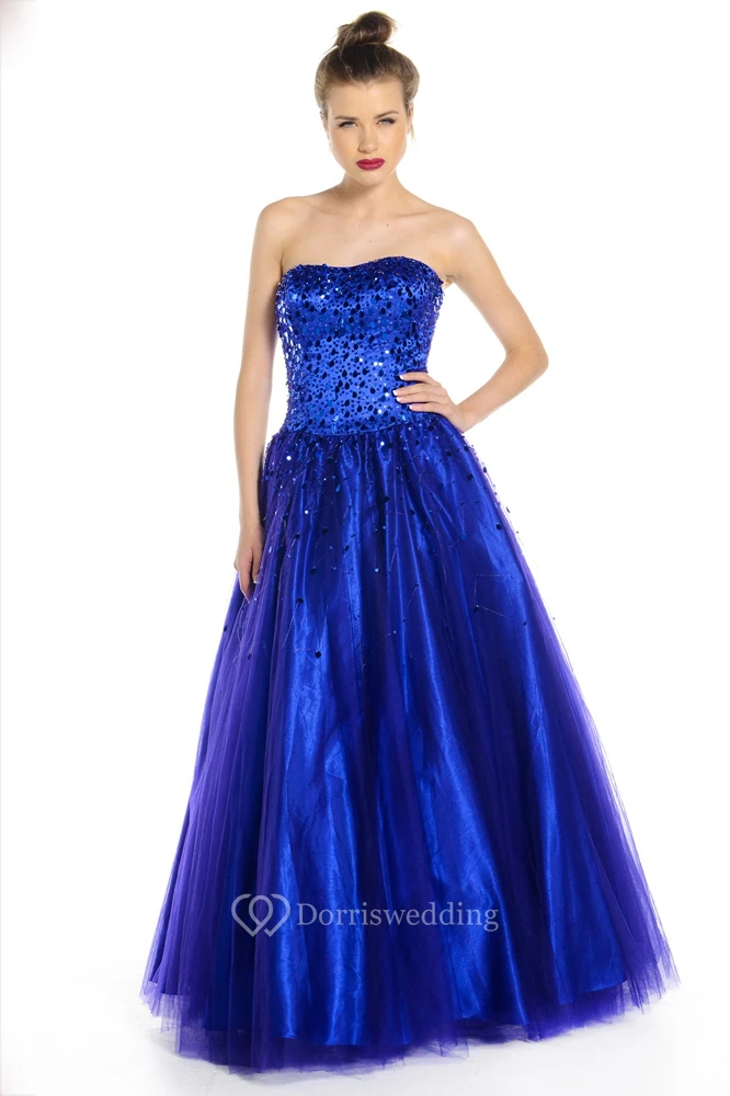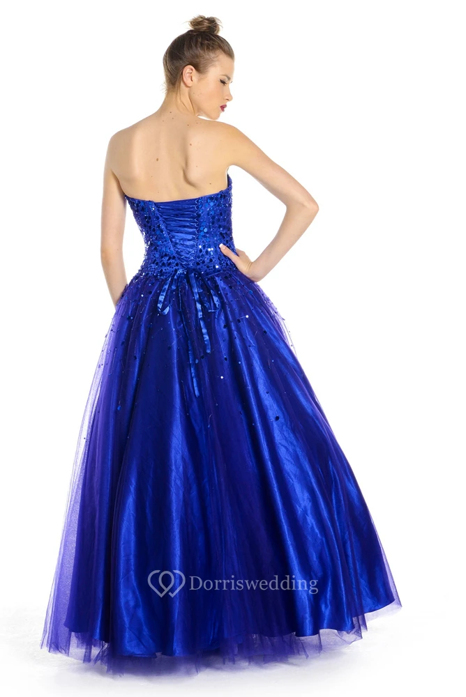 A-Line Sleeveless Long Sequined Strapless Tulle Prom Dress With Corset Back And Bow