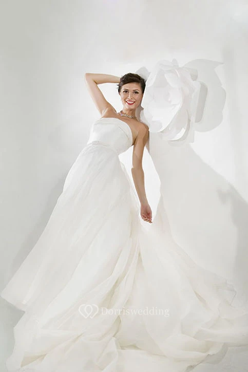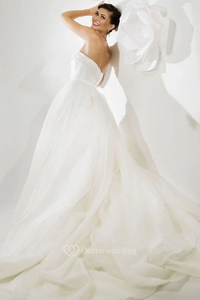 A-Line Sleeveless Long Strapless Satin Wedding Dress With Chapel Train And Backless Style