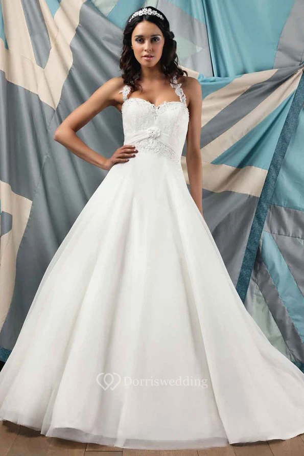 A-Line Sleeveless Long Strapped Appliqued Tulle&Satin Wedding Dress