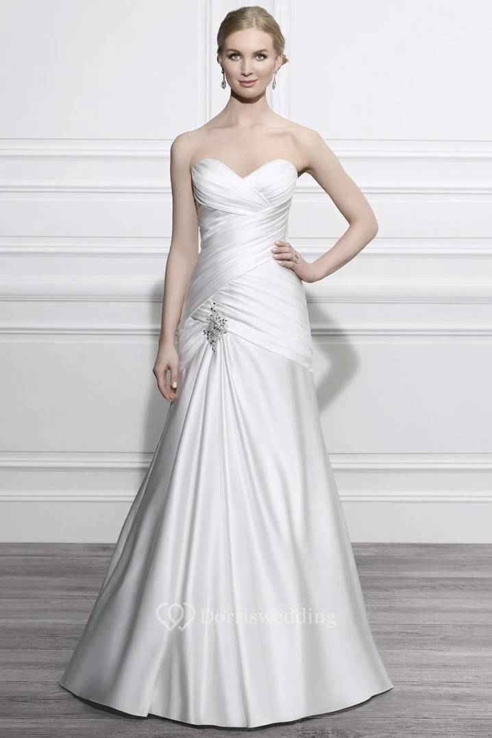 A-Line Sleeveless Long Sweetheart Criss-Cross Satin Wedding Dress With Broach And Backless Style