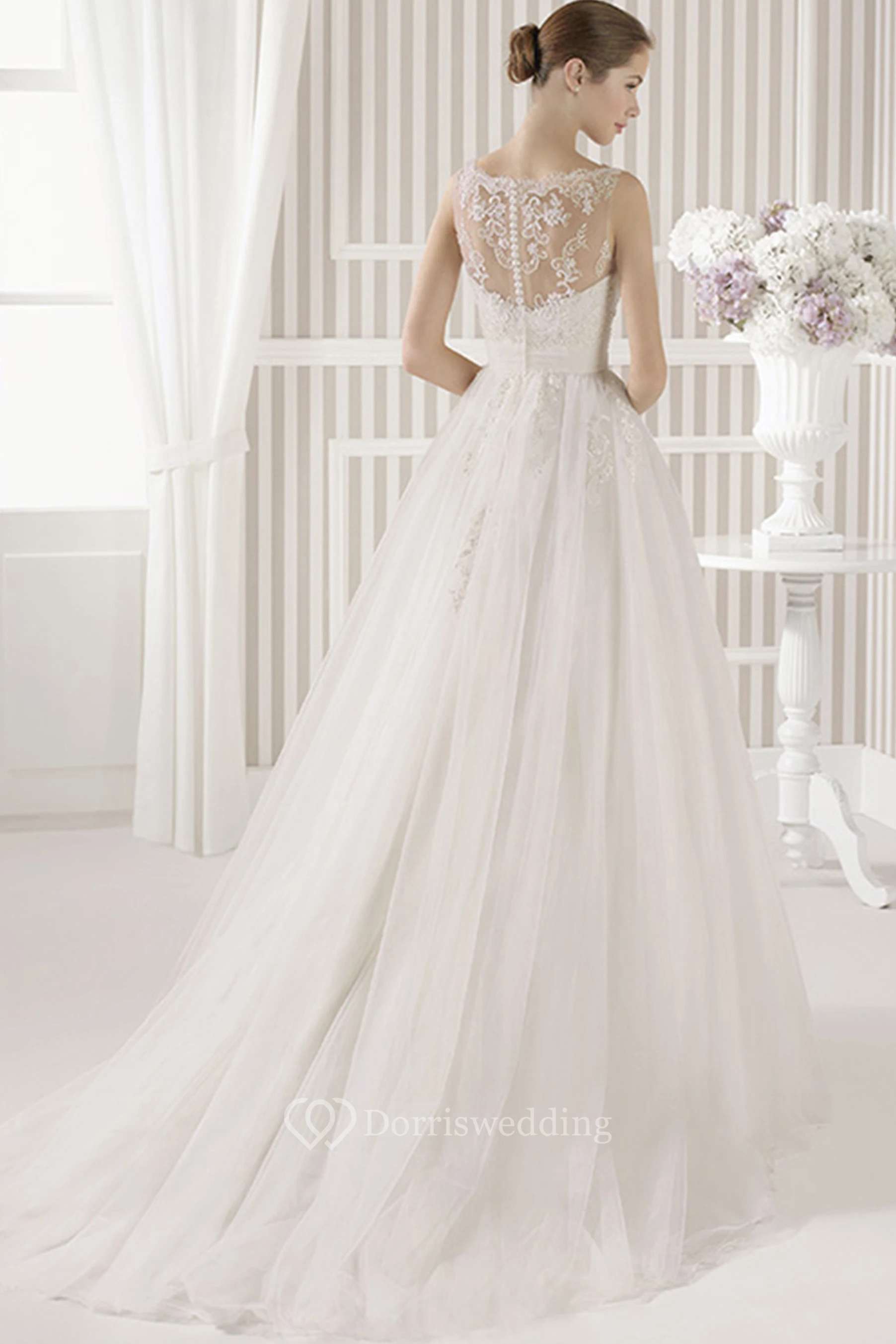A-Line Sleeveless Maxi Appliqued Scoop Tulle&Satin Wedding Dress With Pleats And Illusion Back