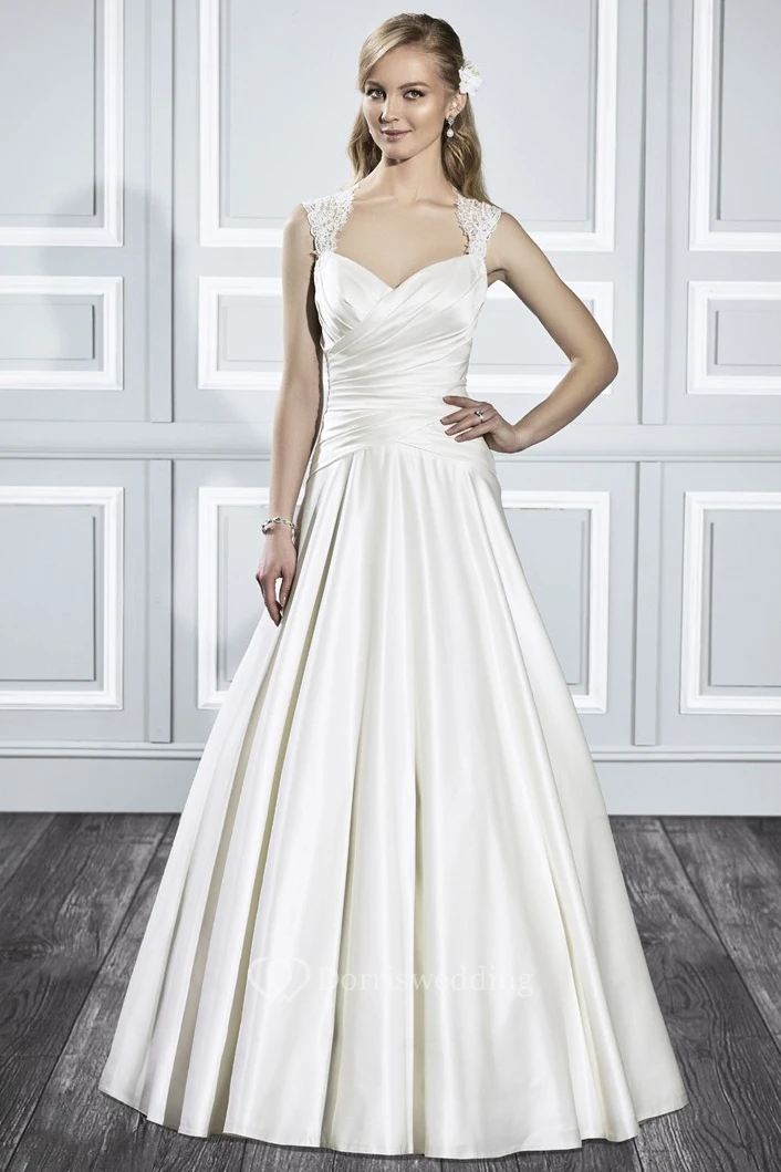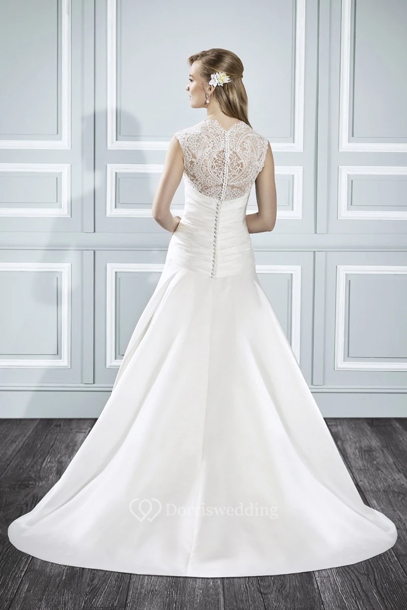 A-Line Sleeveless Queen-Anne Criss-Cross Floor-Length Satin Wedding Dress With Pleats And Illusion Back
