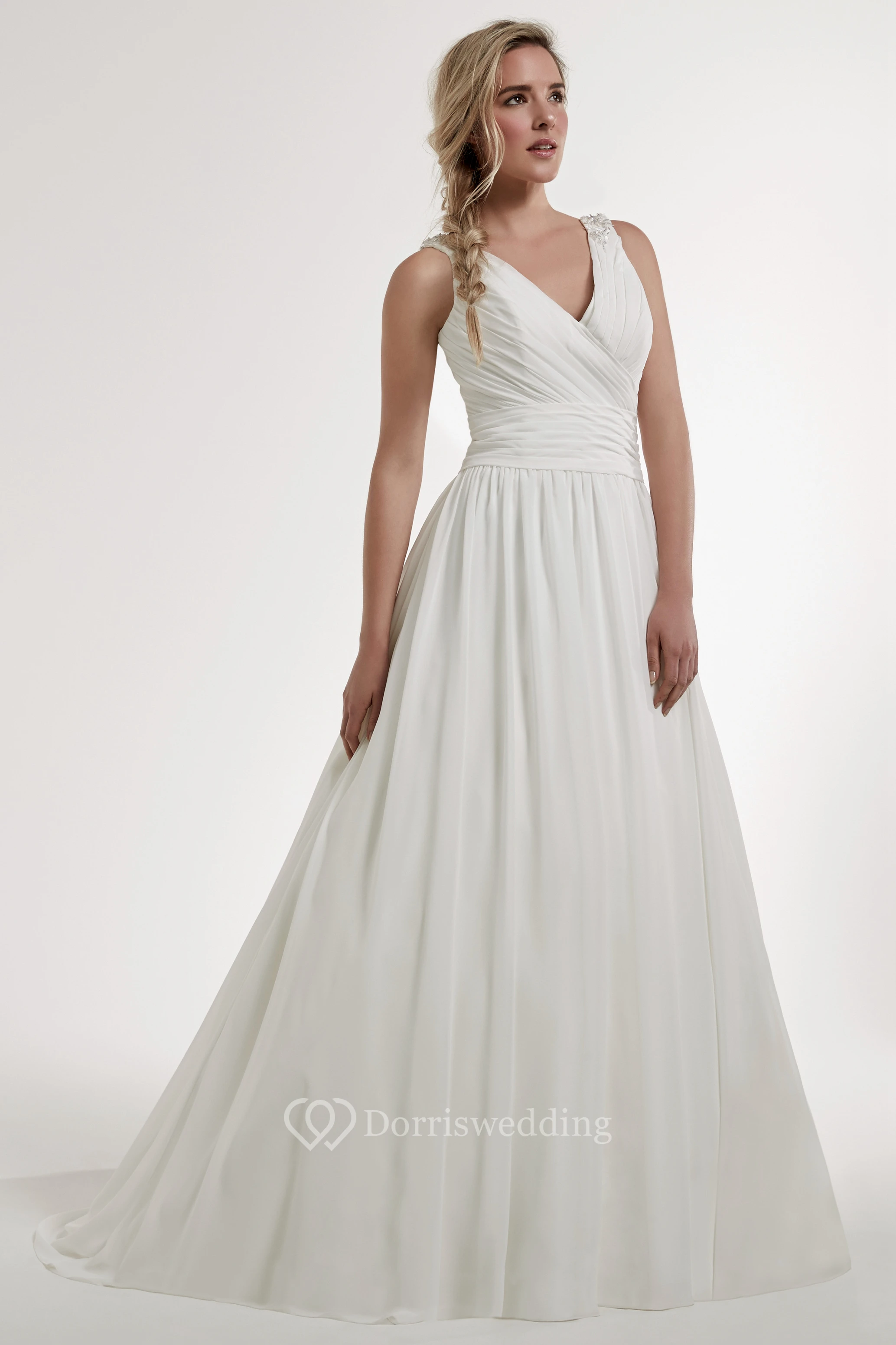 A-Line Sleeveless Ruched Long V-Neck Chiffon Wedding Dress With Illusion Back And Epaulet