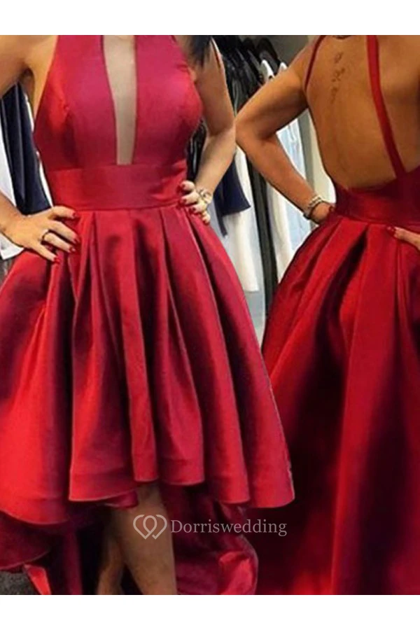A-line Sleeveless Satin Plunging Neckline Open Back Straps High-low Homecoming Dress