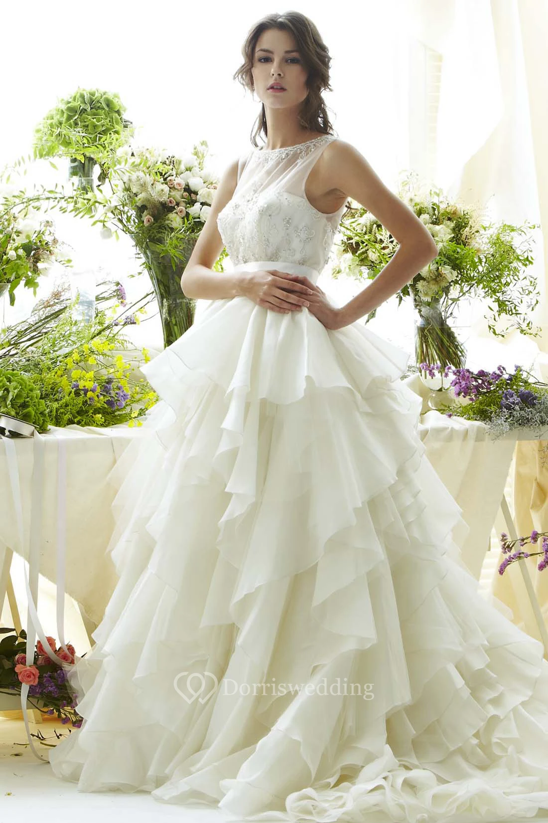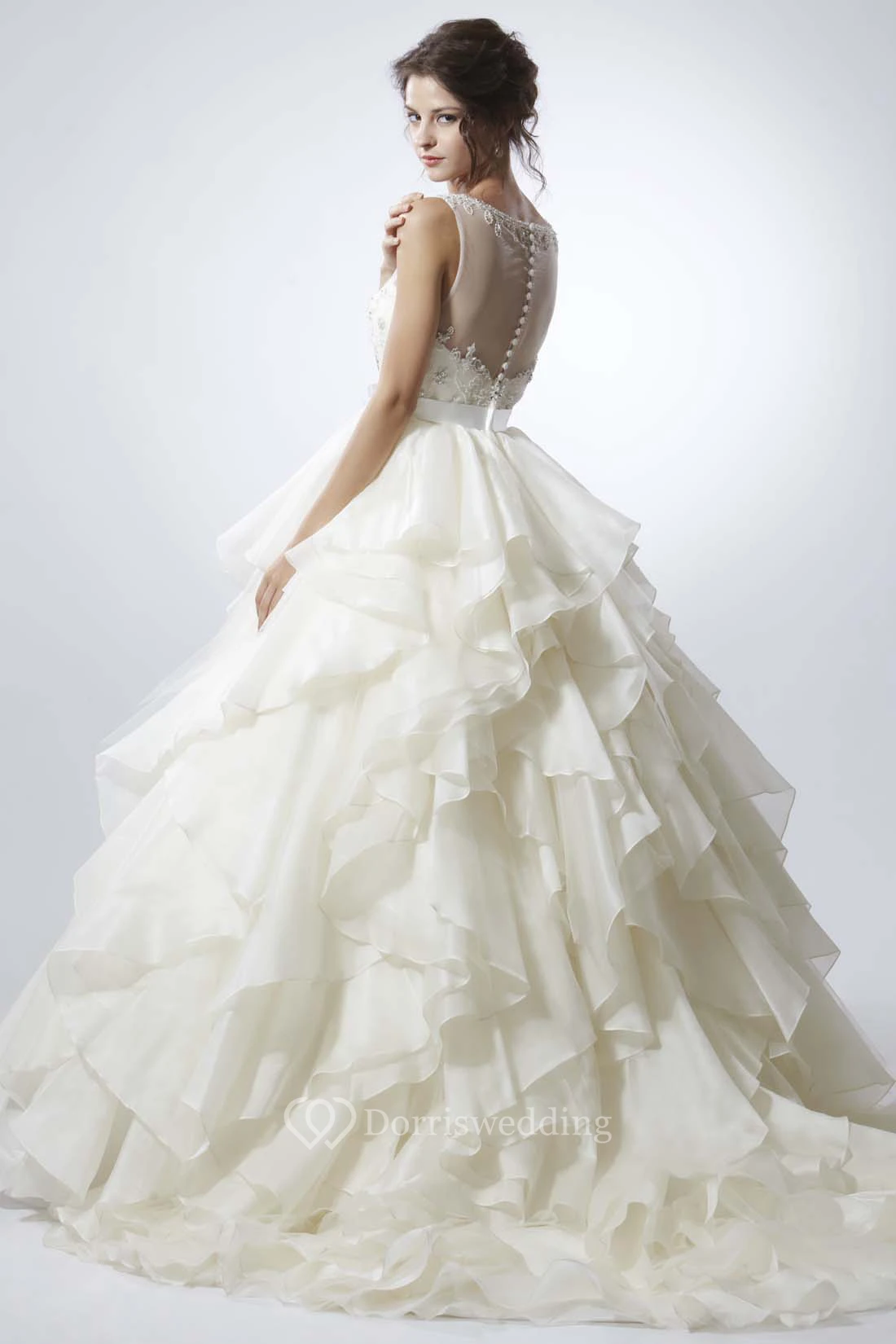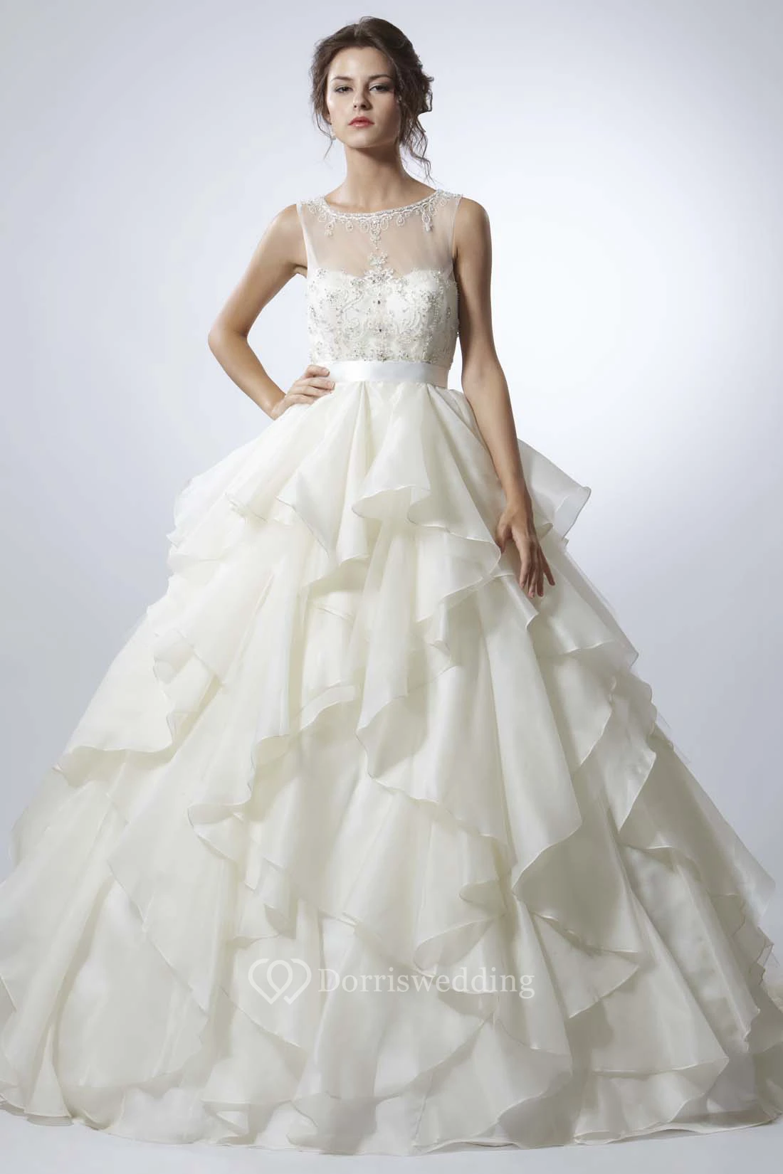 A-Line Sleeveless Scoop Floor-Length Cascading-Ruffle Organza Wedding Dress With Illusion Back And Beading